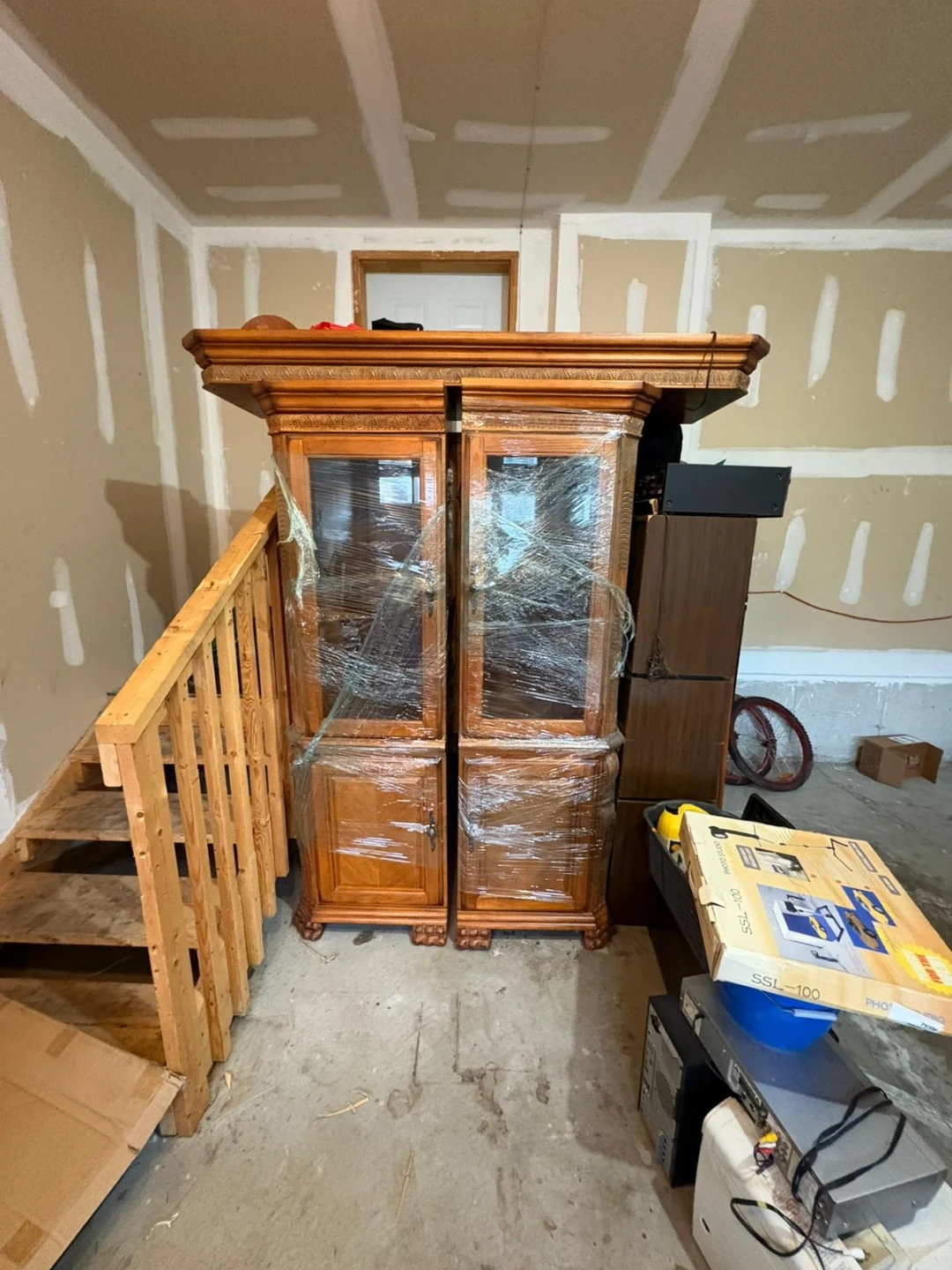 Two-piece wooden china cabinet with glass doors and glass shelving (Three in each glass cabinet) with decorative trim. Features ornate carved details and a tiered top. The bottom section has cabinet doors for storage. It's finished in a warm wood tone. The top part is 72 inches wide, cabinets dimensions below. All measurements are inches.