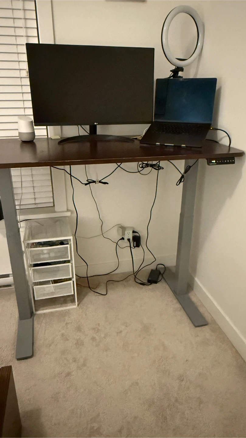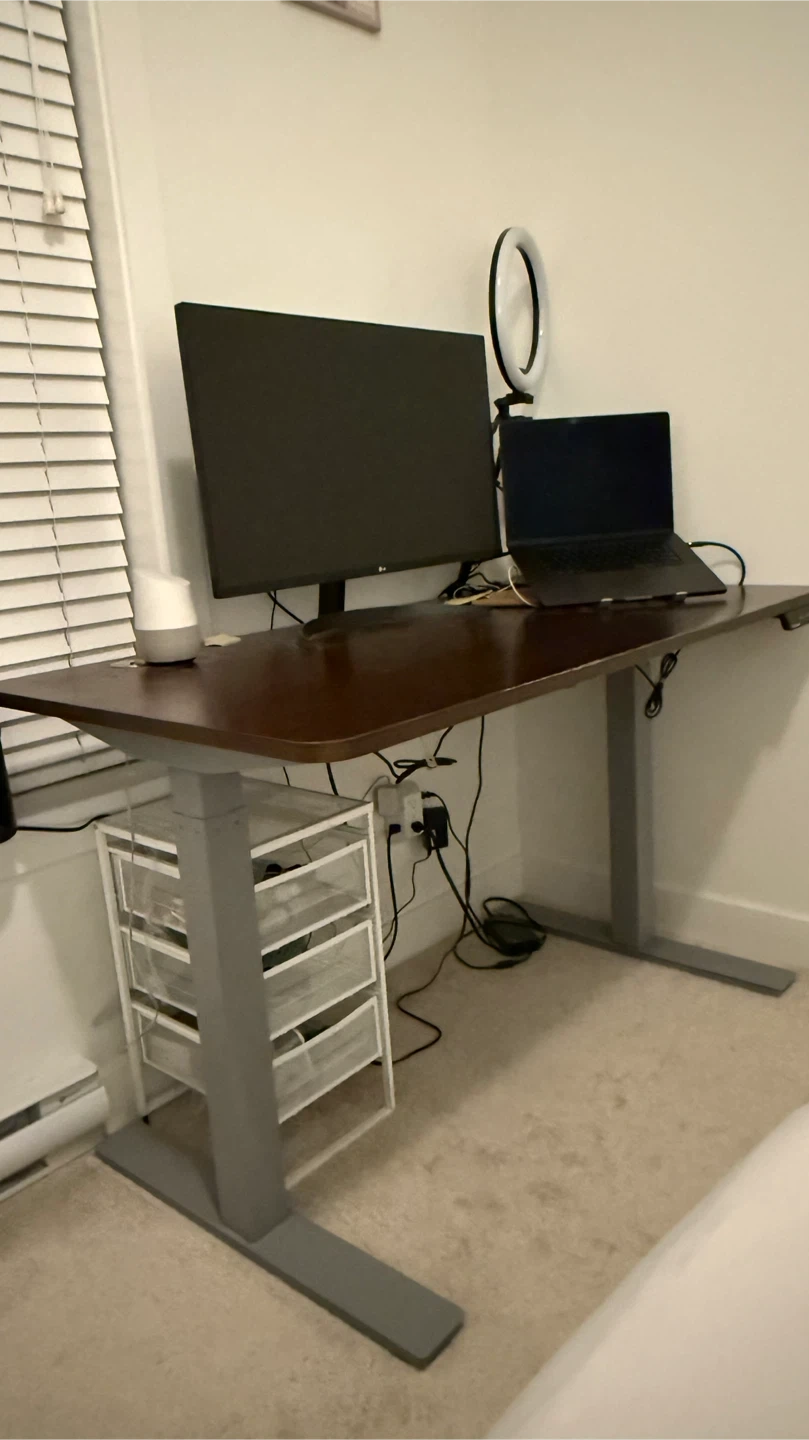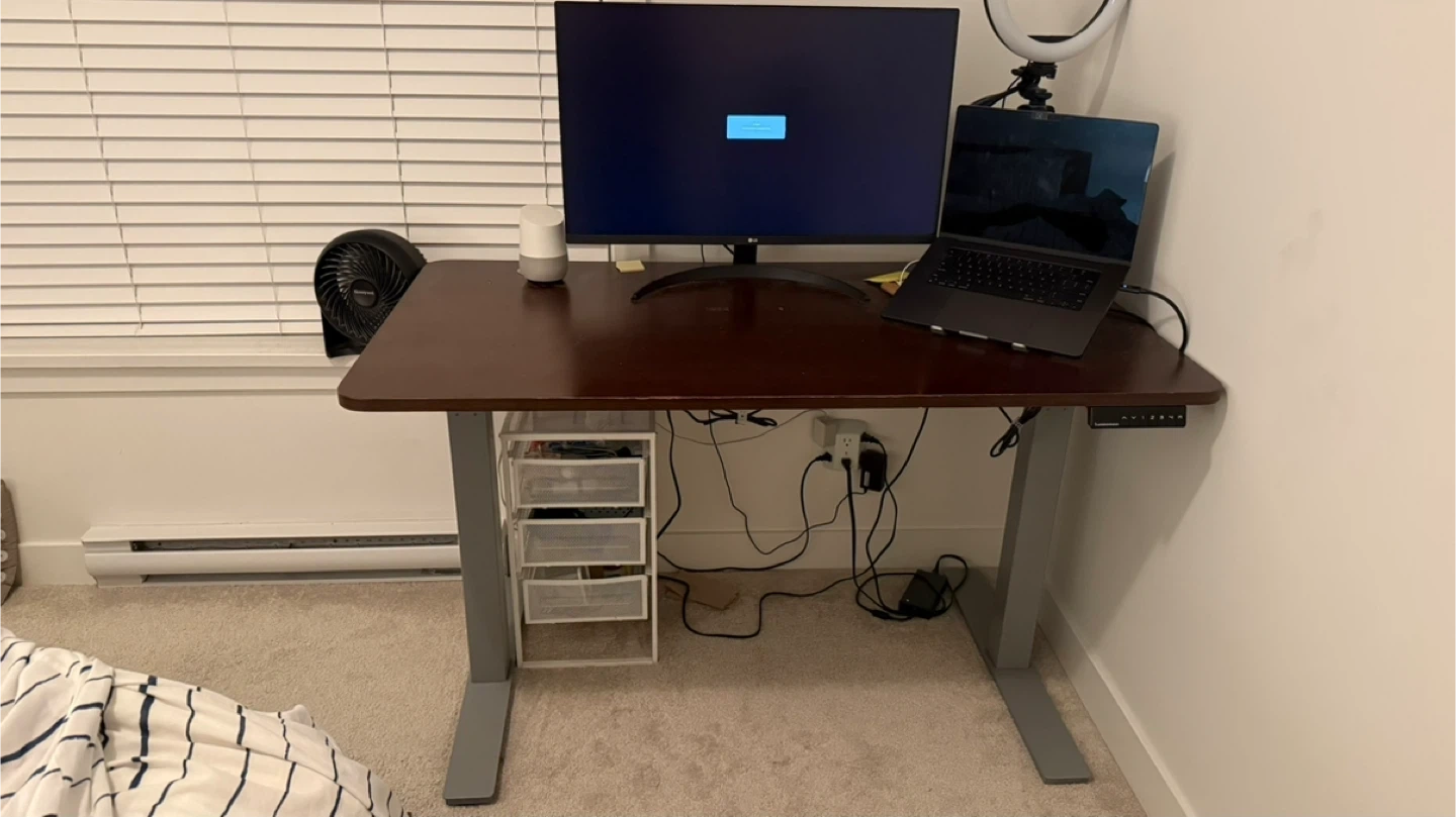 Autonomous standing desk with a dark wood/bamboo table top and grey metal legs. It features an adjustable height control panel with memory presets. This desk is great for a home office setup, allowing you to switch between sitting and standing positions easily.