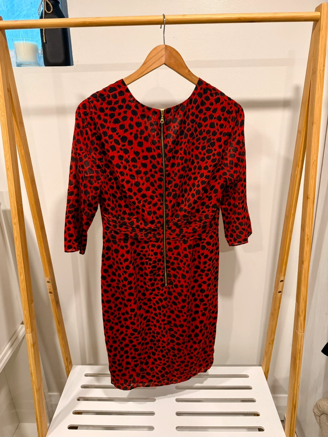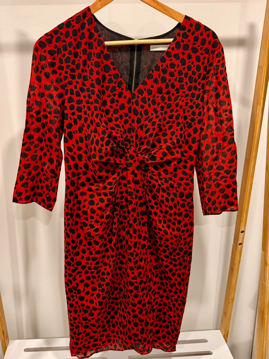 Selling a size 8 Whistles dress in a vibrant red with a black animal print. It features a V-neck and 3/4 sleeves. Perfect for adding a pop of colour to your wardrobe!