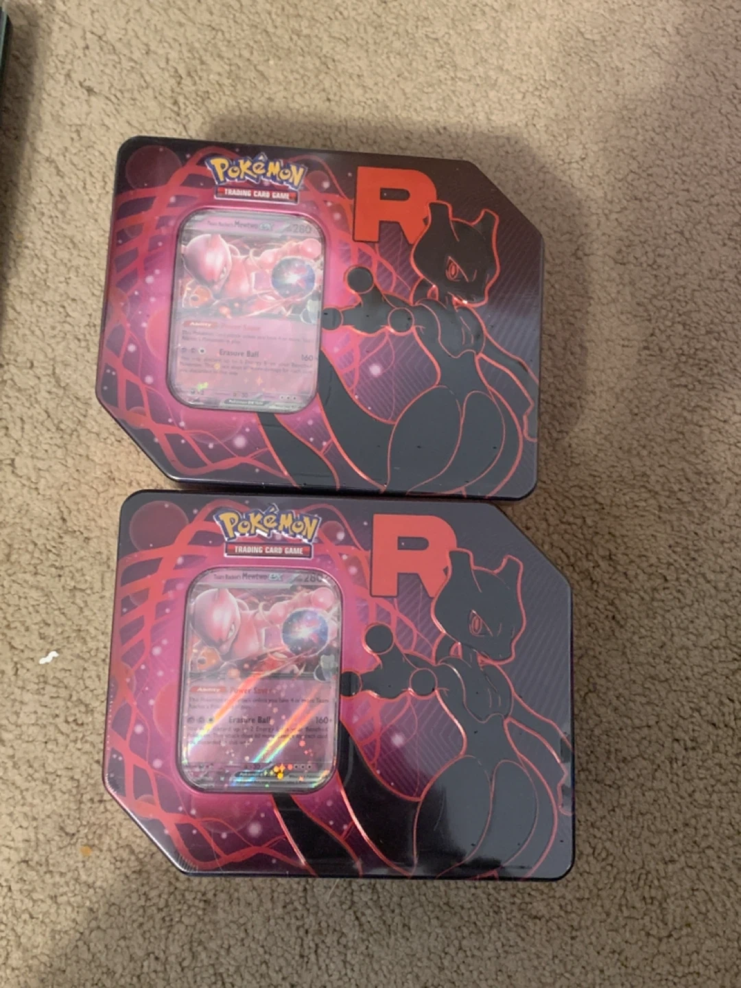 Two Pokemon Trading Card Game tins featuring Mewtwo and Team Rocket.