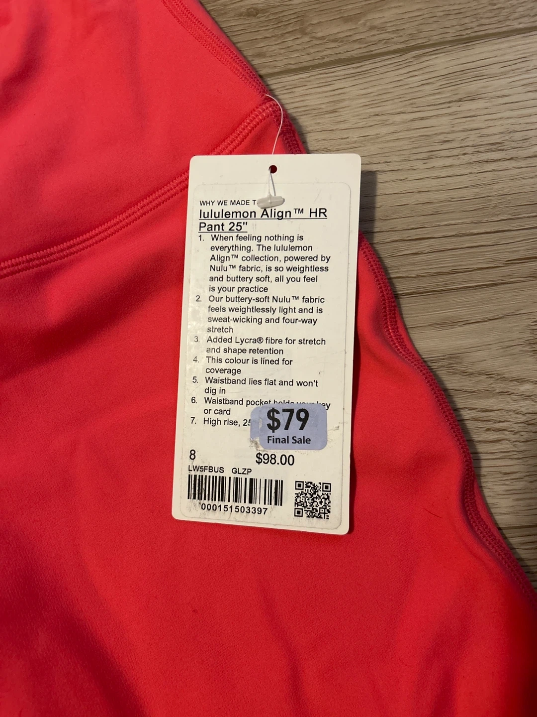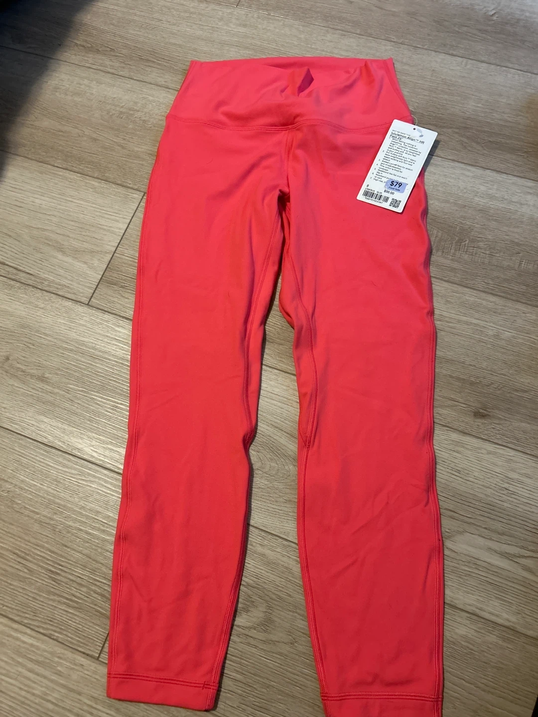 Lululemon Align HR Pant 25" in a bright coral colour. These pants are made with Nulu™ fabric for a buttery-soft feel. They offer a lightweight and sweat-wicking experience with added Lycra® fibre for stretch and shape retention. High rise with a waistband that lies flat.