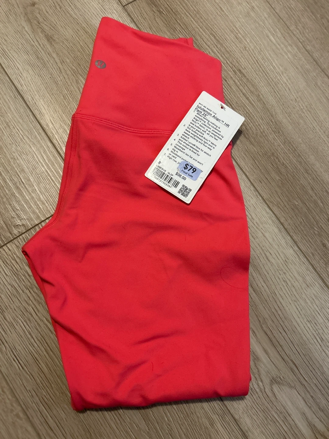 Lululemon Align HR Pant 25" in a bright coral colour. These pants are made with Nulu™ fabric for a buttery-soft feel. They offer a lightweight and sweat-wicking experience with added Lycra® fibre for stretch and shape retention. High rise with a waistband that lies flat.