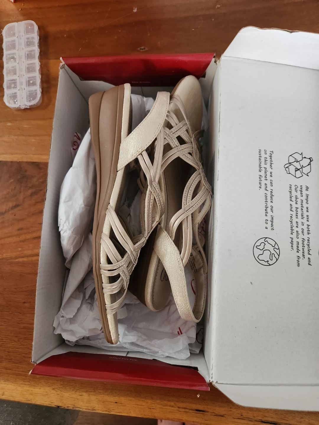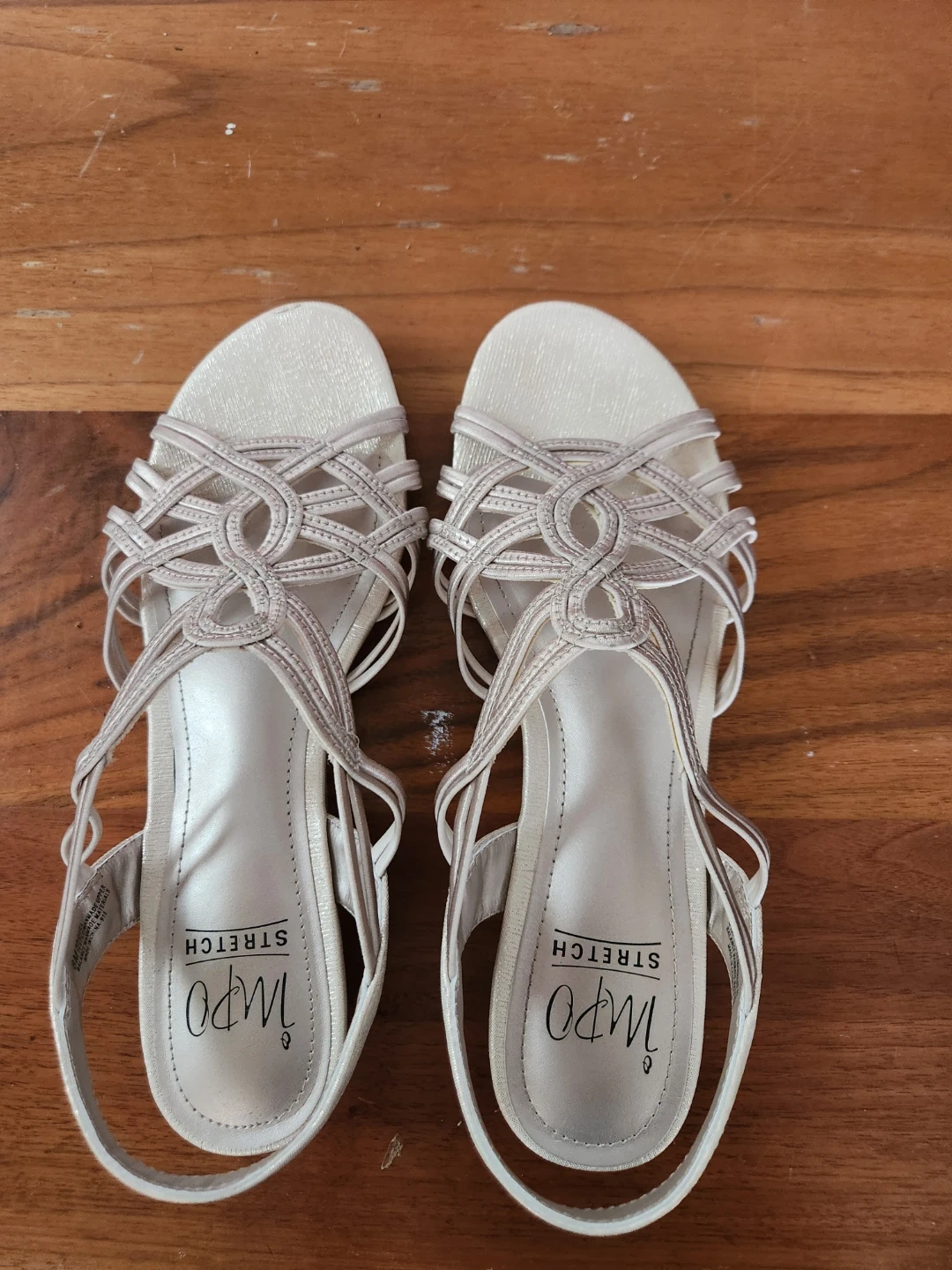 These Impo sandals feature a stylish crisscross design. They have a comfortable stretch fit. The neutral metallic colour makes them versatile for many outfits! Comes with a box, worn once.