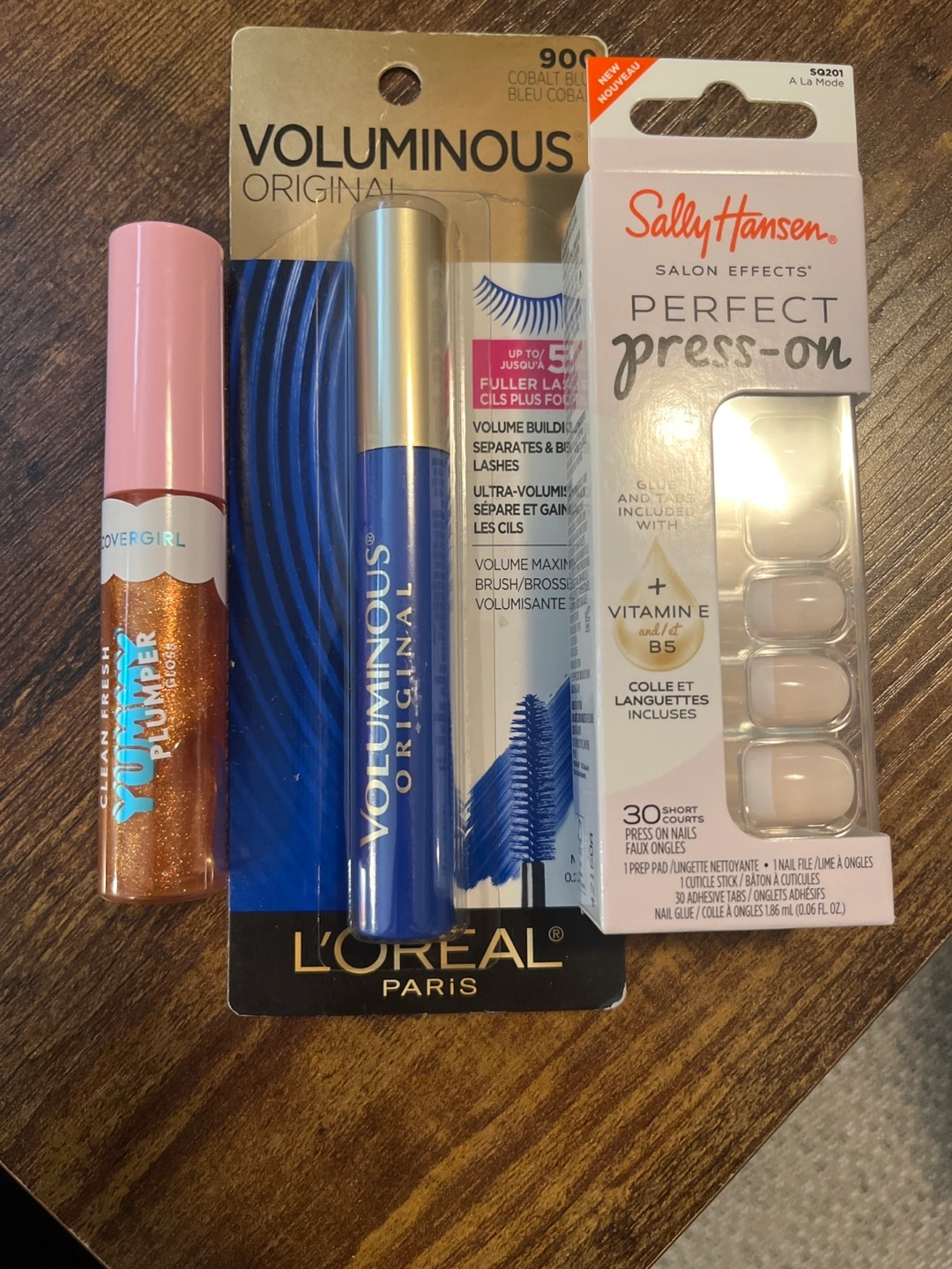 Bundle of three beauty products. Includes L'Oréal Voluminous Original Mascara, Covergirl YUMPlump Clean Fresh Lip Gloss, and Sally Hansen Perfect Press-on Nails. New and unused.