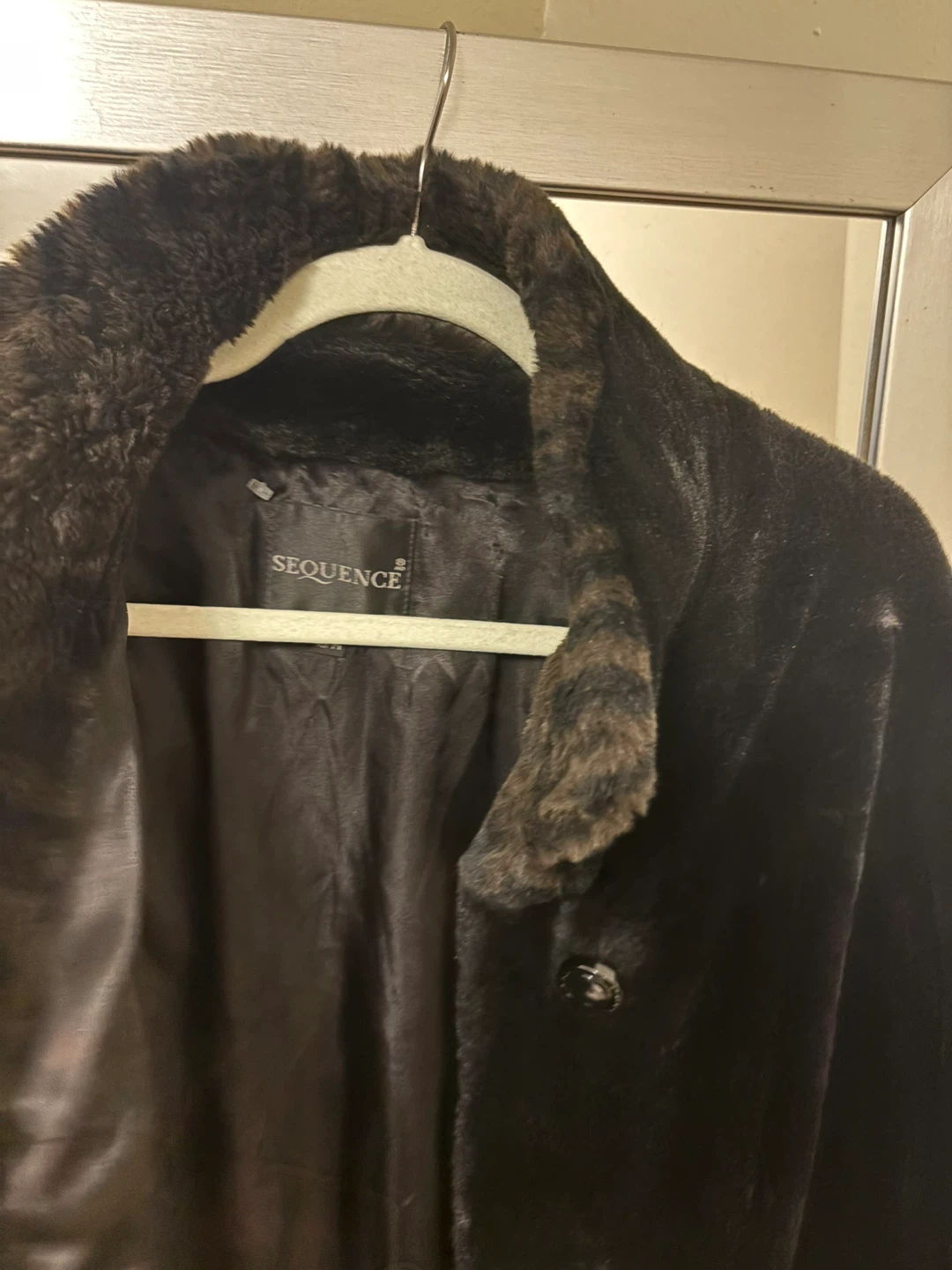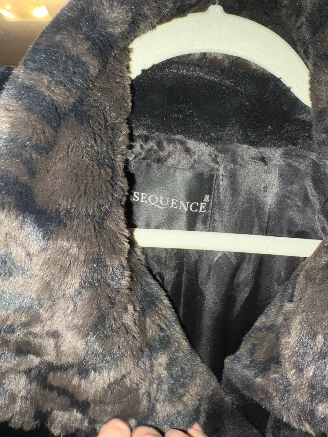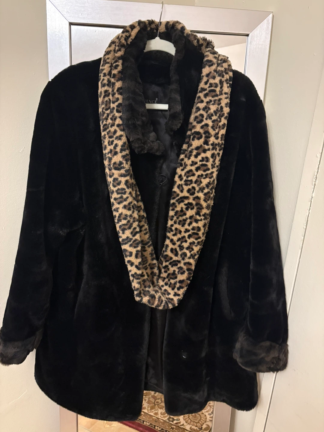 This black faux fur coat is from SEQUENCE. It features a cozy faux fur lining and trim with a matching leopard print scarf. It's perfect for staying warm and stylish during colder weather!
