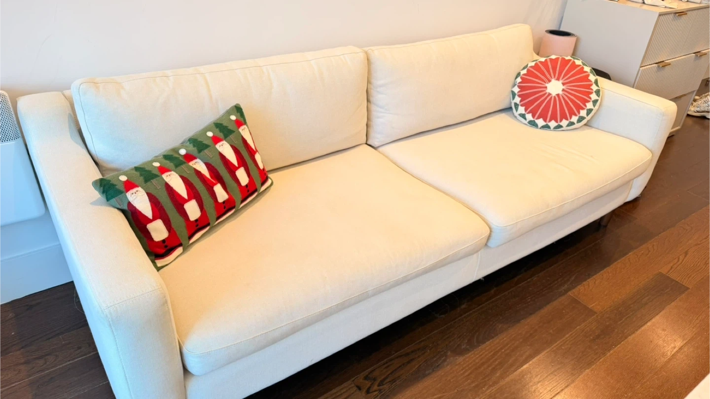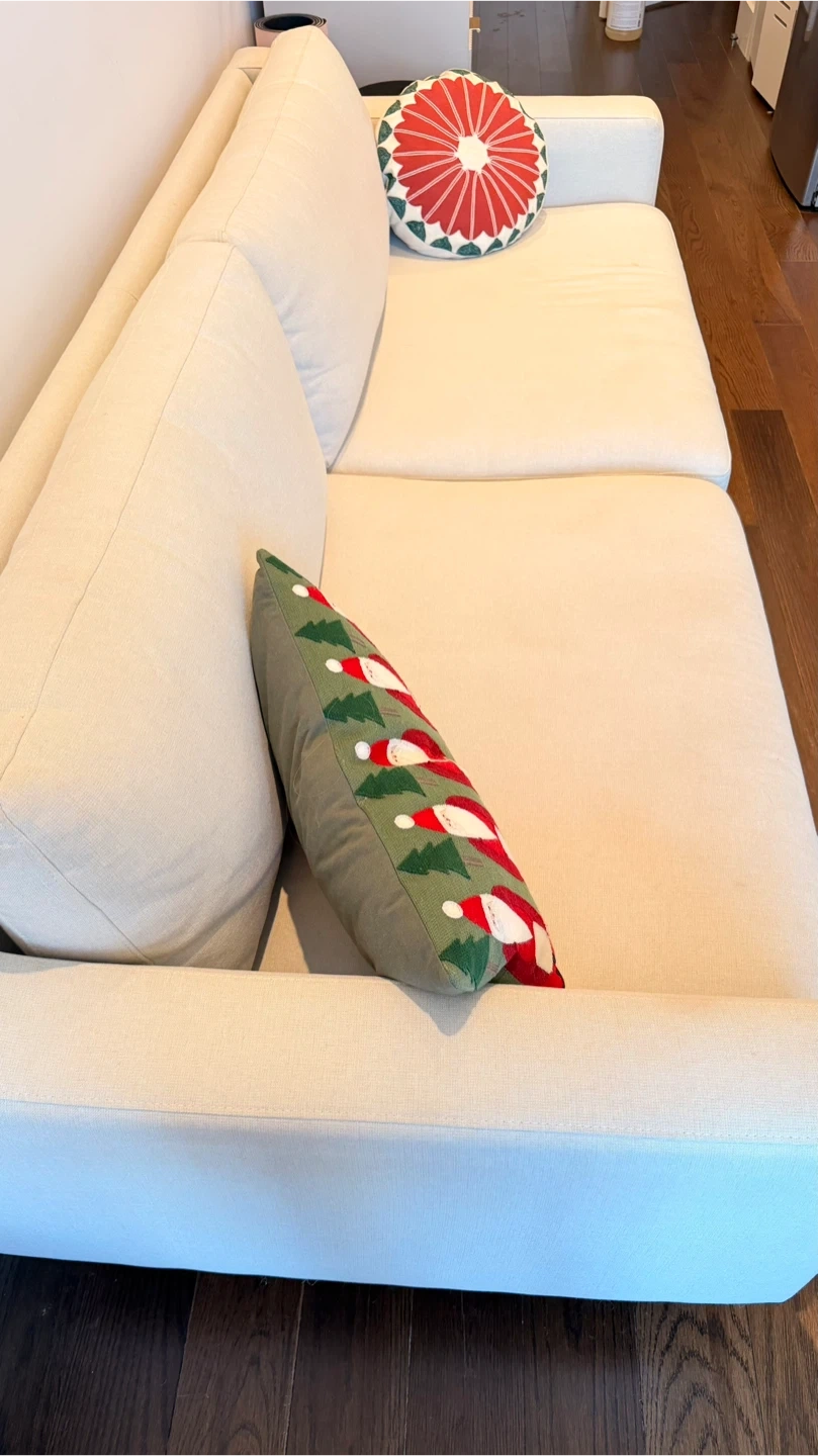 Very comfortable seating, supportive cushions, and sturdy frame. Fabric is in great shape — well maintained in a clean home.
