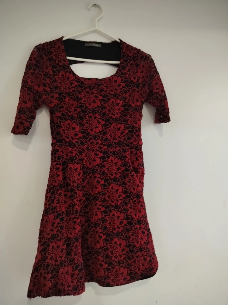 Gorgeous red and black lace skater dress. Features a keyhole back and short sleeves. Perfect for a special occasion.