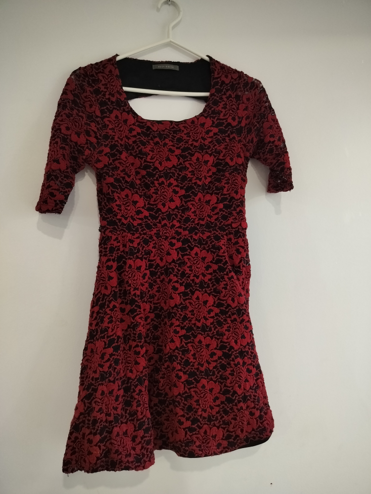 Gorgeous red and black lace skater dress. Features a keyhole back and short sleeves. Perfect for a special occasion.