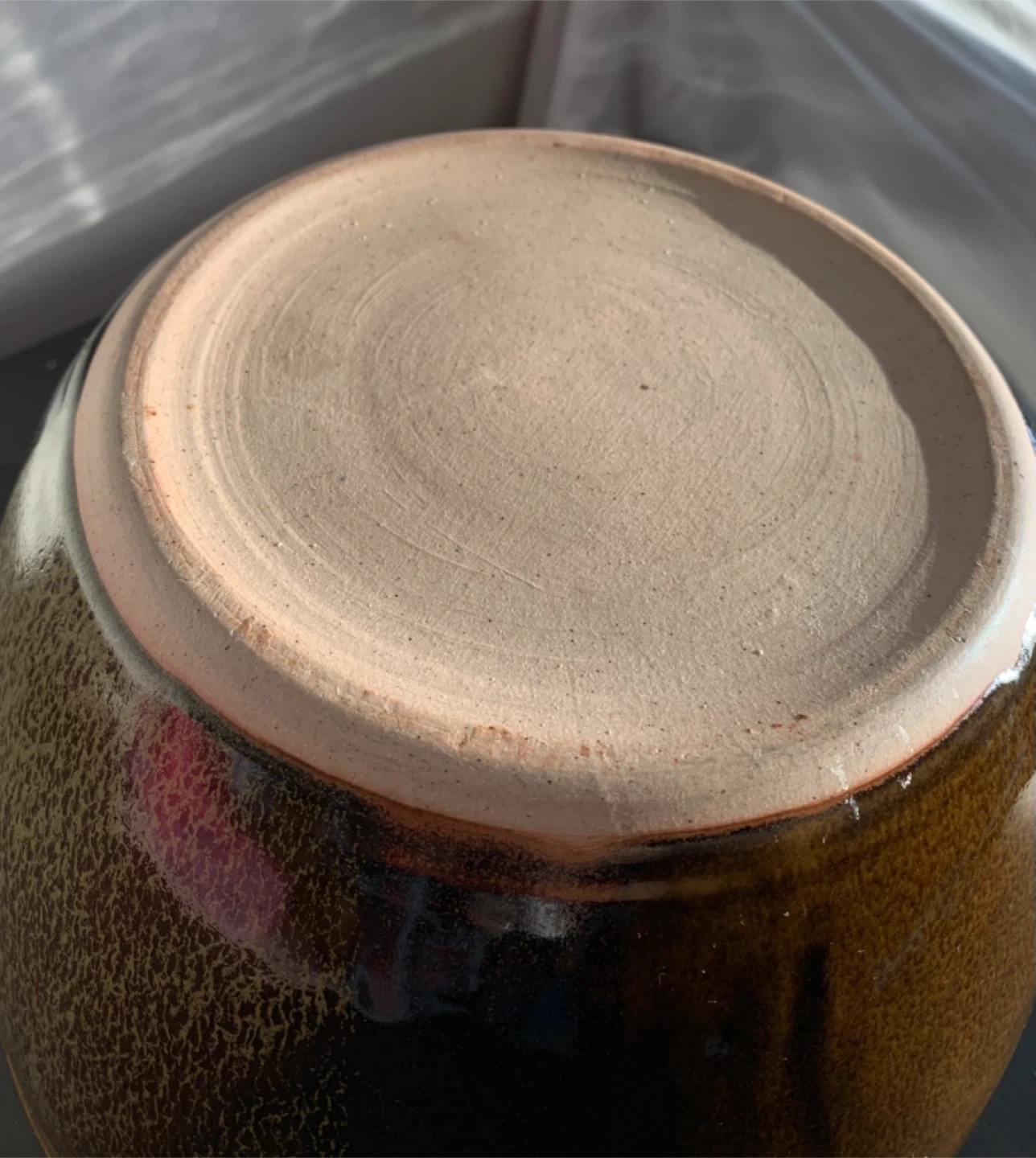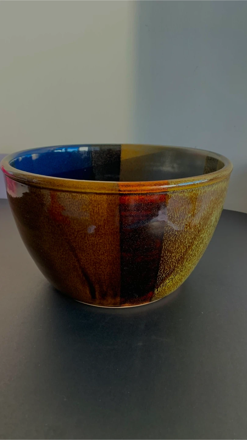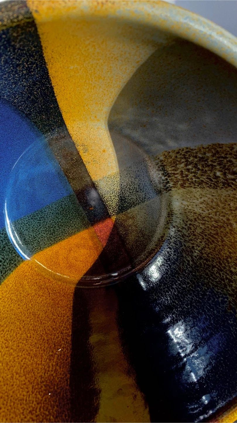 It features a unique and colourful design with shades of cobalt blue, caramel brown, taupe, and orange-red. Perfect for adding a touch of artistry to your creative process in the kitchen.
