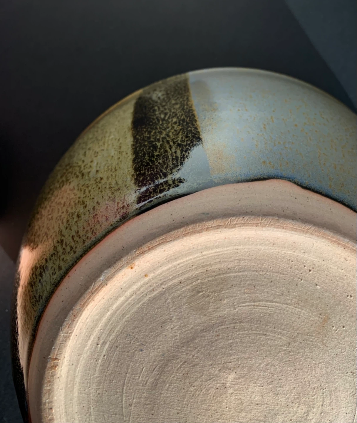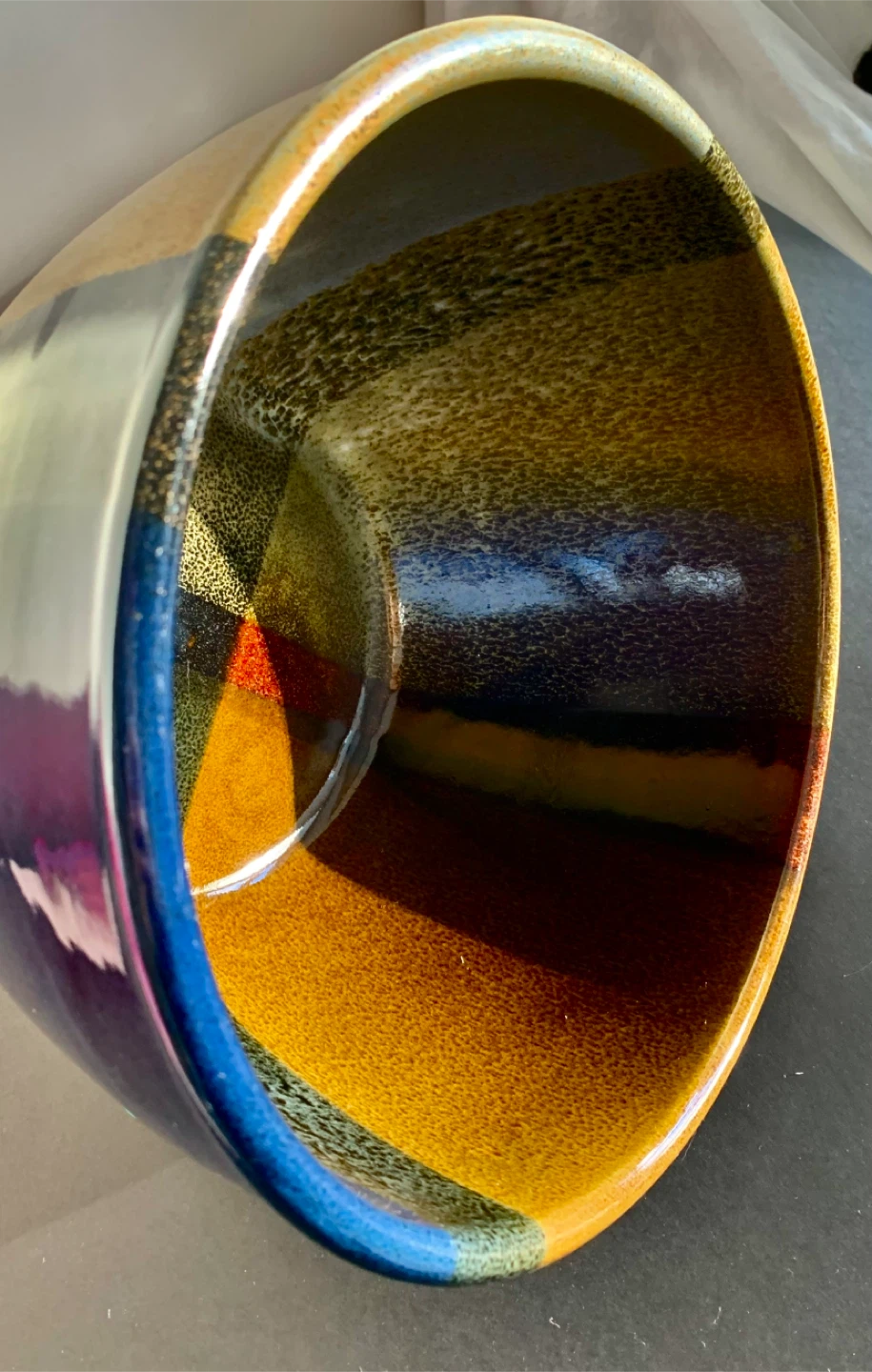 It features a unique and colourful design with shades of cobalt blue, caramel brown, taupe, and orange-red. Perfect for adding a touch of artistry to your creative process in the kitchen.