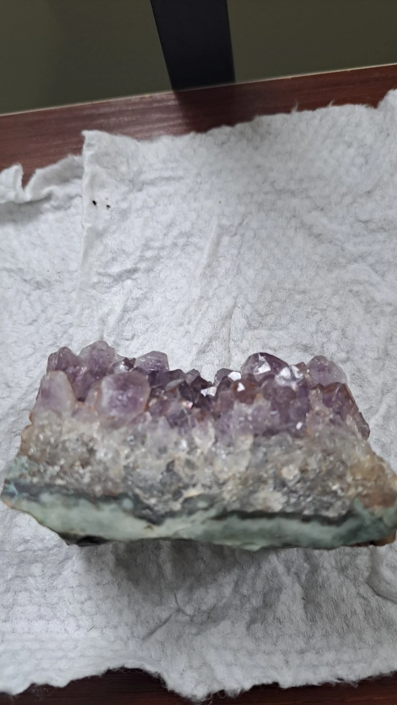 This amethyst geode cluster displays beautiful purple crystals. It's mounted on a rock base with a greenish-grey outer layer. Nice piece for decor!