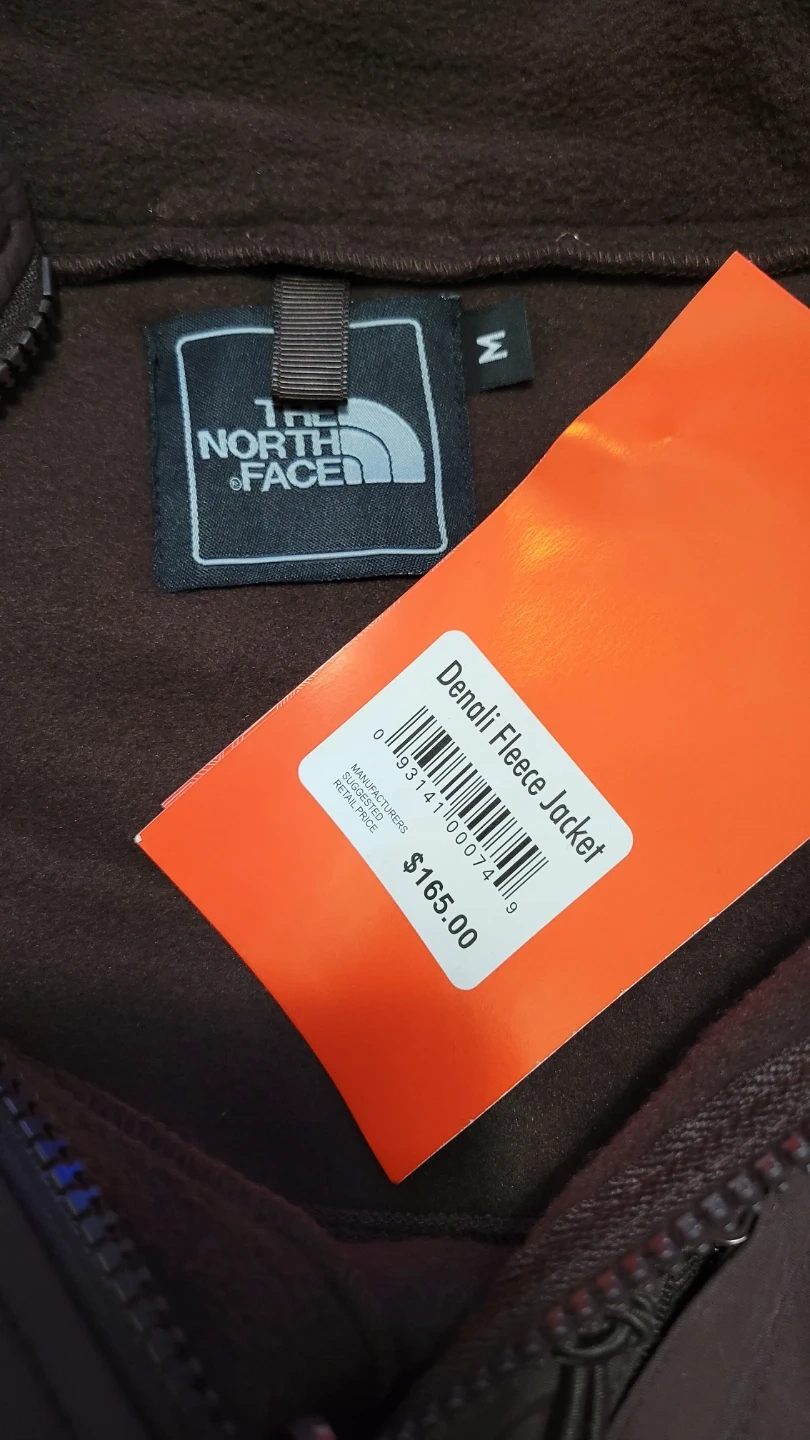 This is The North Face Denali Fleece Jacket in size medium. It's a full-zip jacket made of fleece material. It has a brown color scheme.