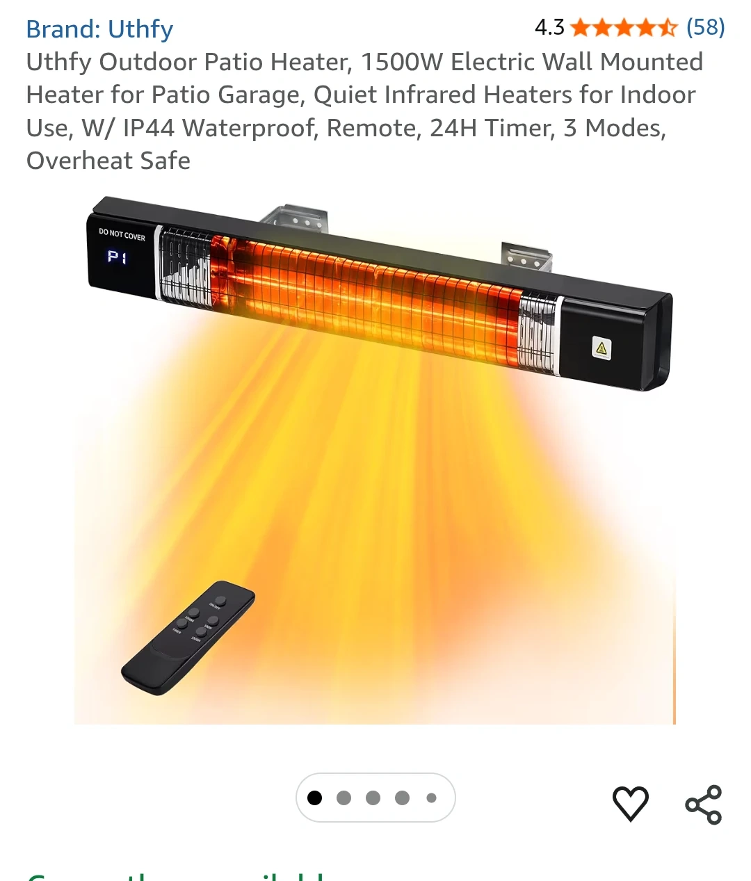 This Uthfy outdoor patio heater has 1500W of quiet infrared heating power. It's wall-mounted and comes with a remote, a 24H timer, and 3 modes. It's also IP44 waterproof and overheat safe