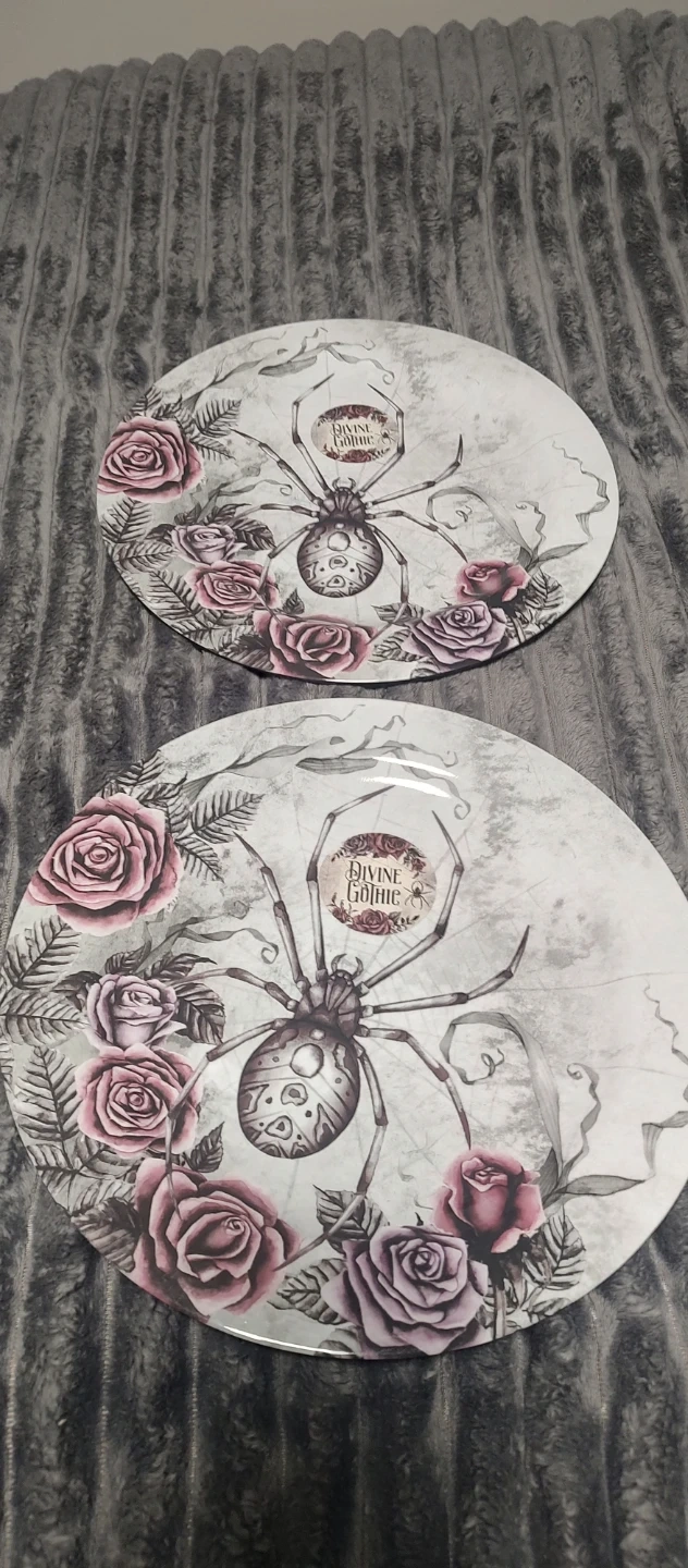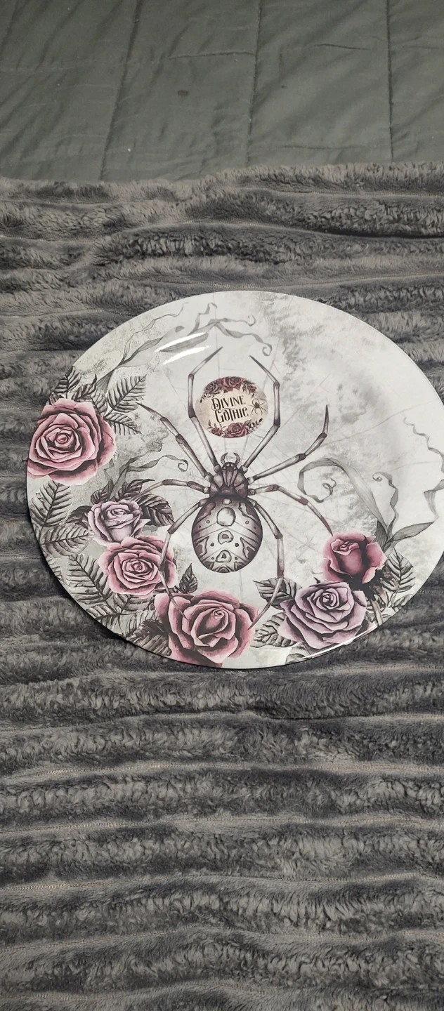 Selling two decorative plates with a Divine Gothic spider and rose design. These plates would be perfect for adding a touch of gothic charm to your home decor