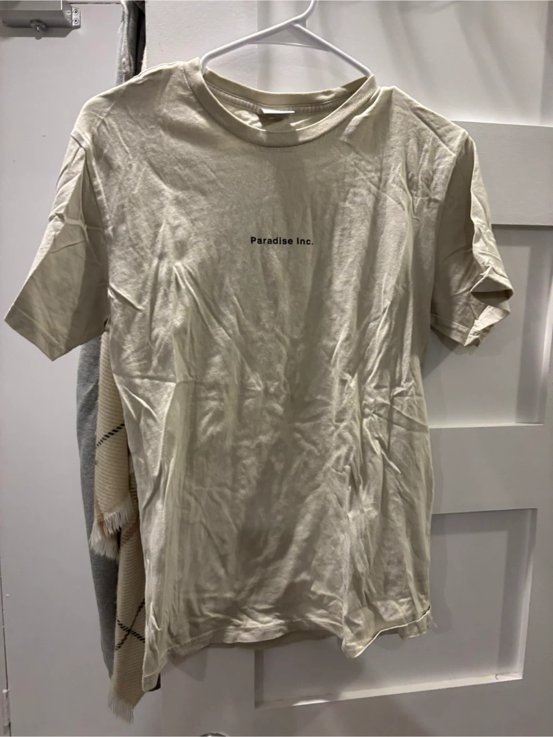 Light-coloured t-shirt with "Paradise Inc." printed on the chest. Crew neck, short sleeves. Cotton material.