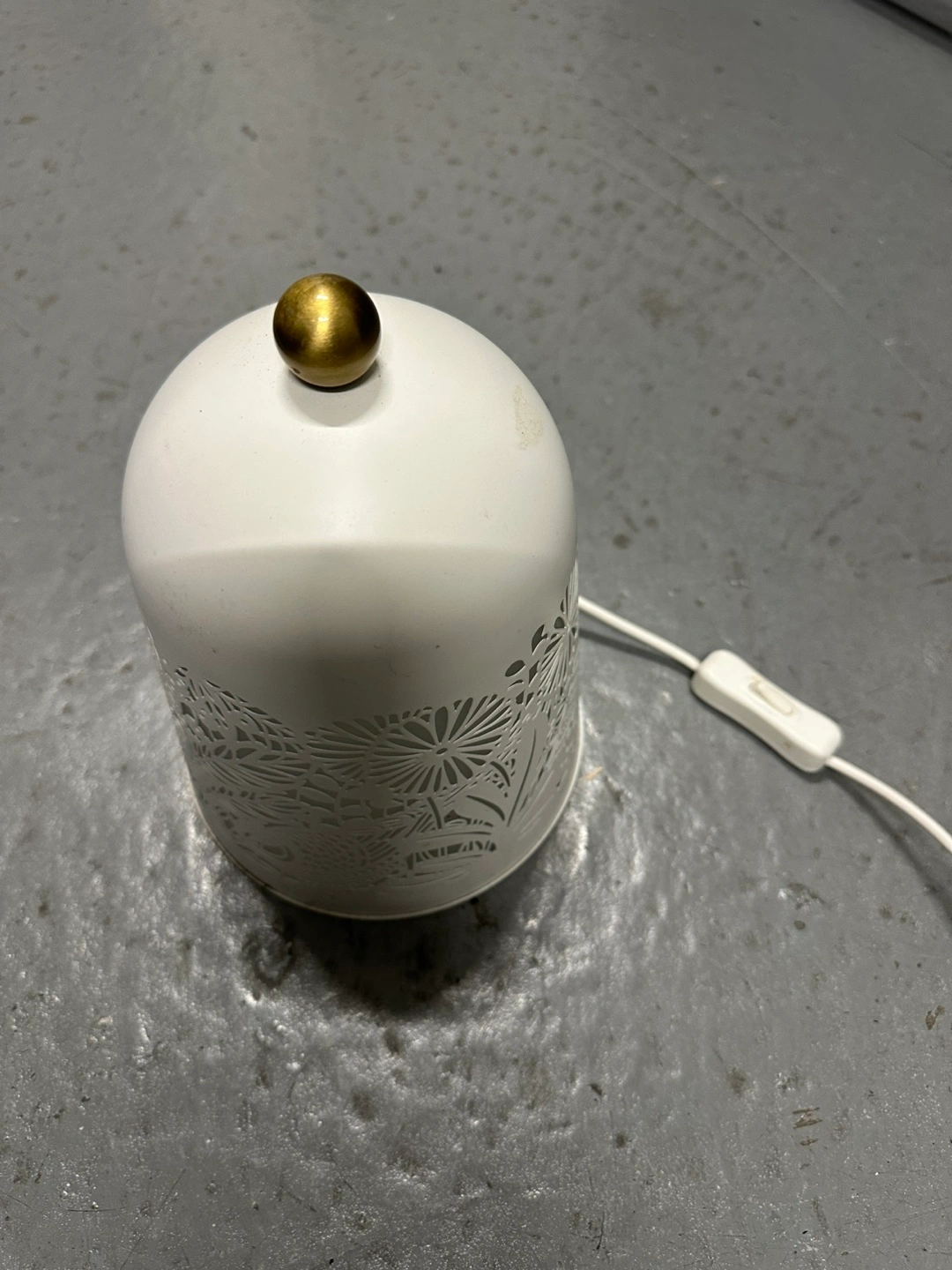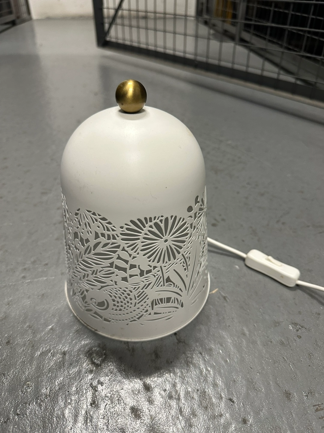 Here's a lovely white table lamp that would add a touch of elegance to any room! It features a delicate floral cutout design and a gold-coloured accent on top. It's in great condition and ready to brighten up your space