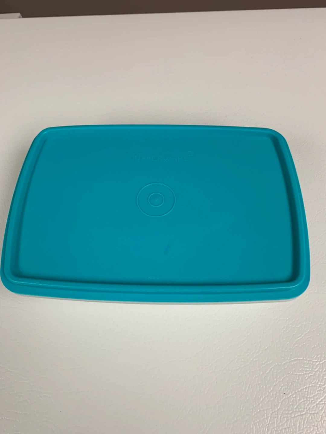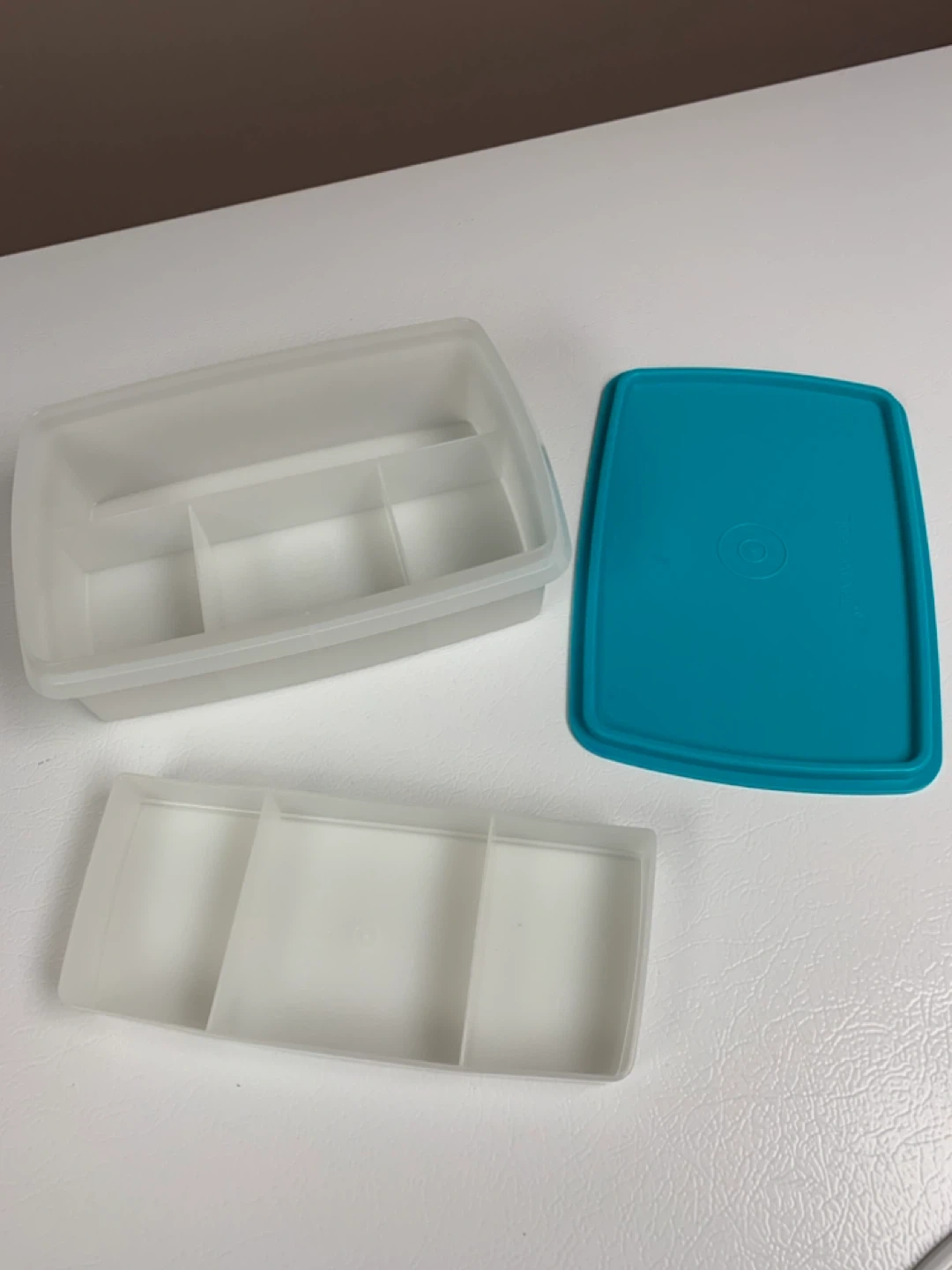 This is a Tupperware Modular Mates rectangular container. It's a clear base with a teal lid and includes a removable divider.