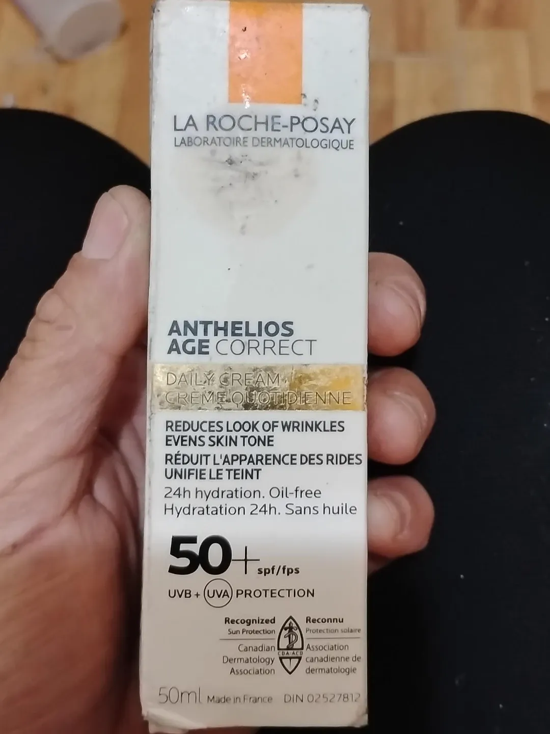 This is La Roche-Posay Anthelios Age Correct Daily Cream. It offers 24h hydration and is oil-free with SPF 50+ protection. This daily cream reduces the look of wrinkles and evens skin tone. It's made in France and comes in a 50ml size.