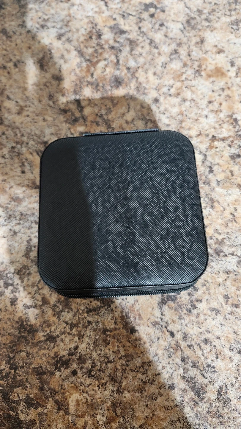 This black travel jewelry organizer is perfect for keeping your accessories tidy on the go. It's compact and features dedicated slots for rings and earrings, plus a larger compartment for necklaces or bracelets. Great for trips or everyday storage!