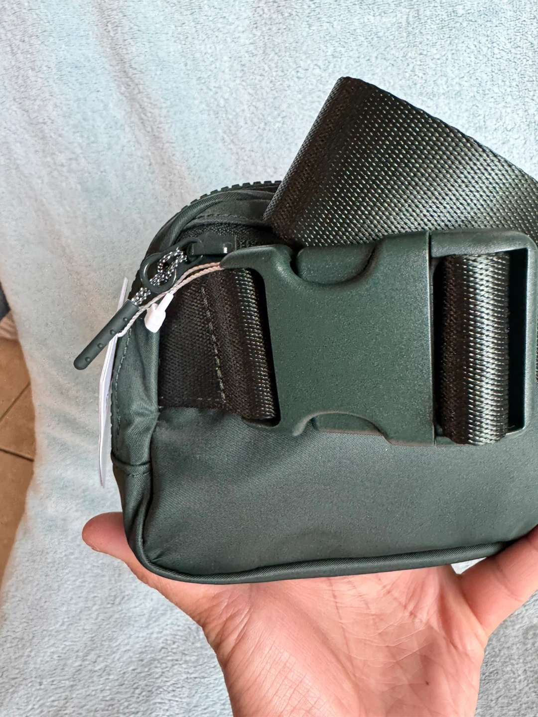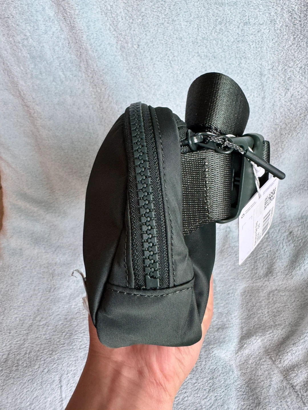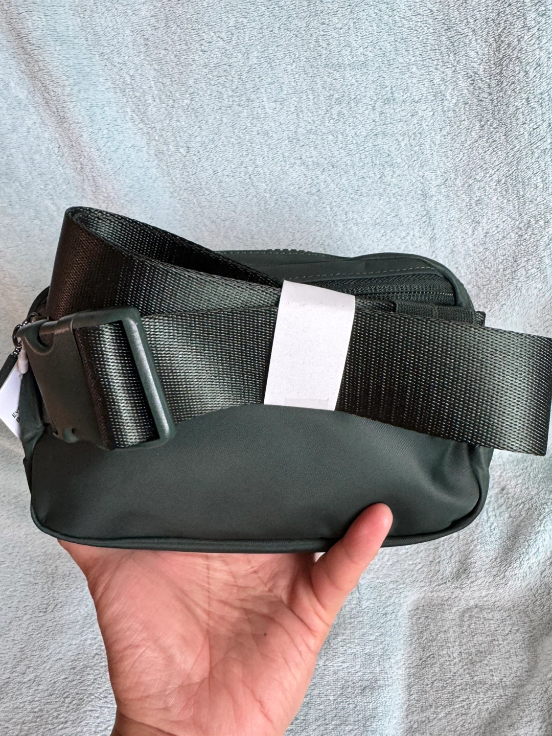 This Lululemon Everywhere Belt Bag is in a dark green colour. It's made from a water-repellent fabric. The strap is adjustable with a buckle closure.
