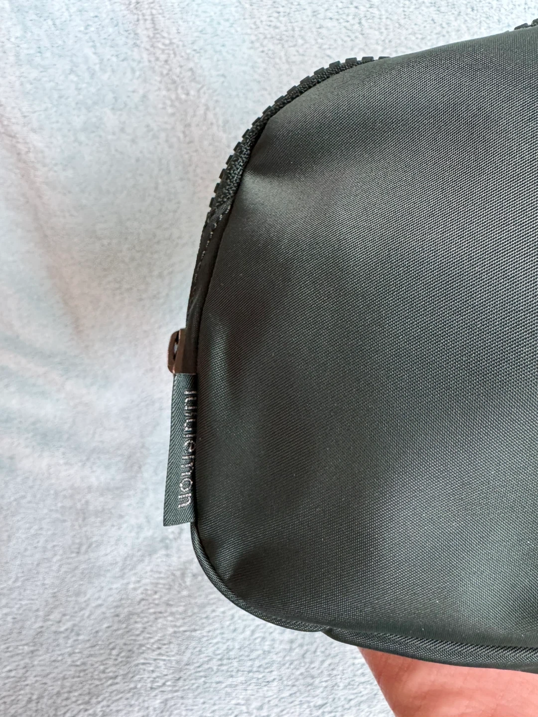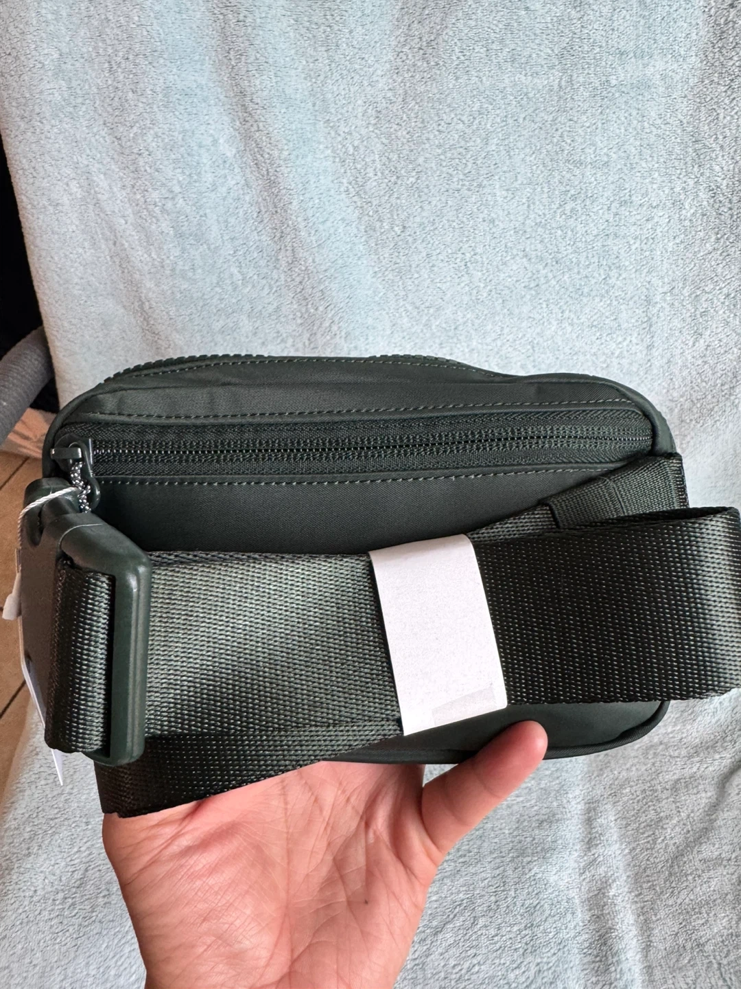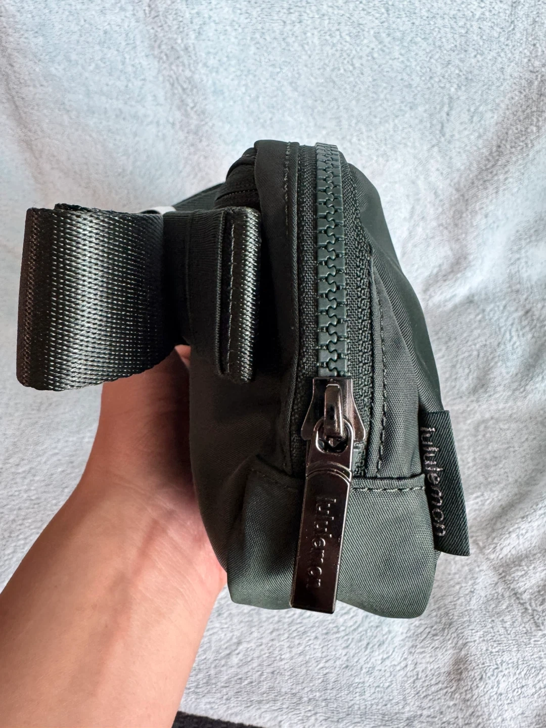 This Lululemon Everywhere Belt Bag is in a dark green colour. It's made from a water-repellent fabric. The strap is adjustable with a buckle closure.