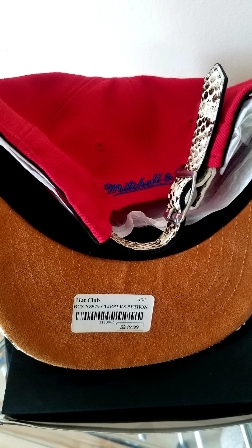 Mitchell & Ness snapback hat featuring the Los Angeles Clippers logo. Red crown with a cream-coloured python-textured brim. Includes original sticker showing $249.99 retail price.
