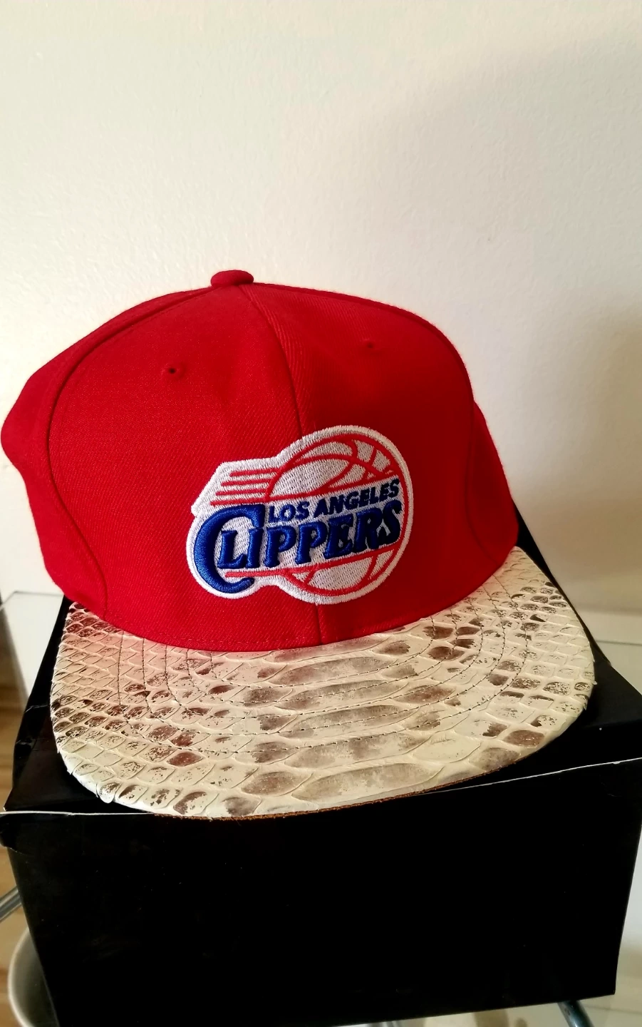 Mitchell & Ness snapback hat featuring the Los Angeles Clippers logo. Red crown with a cream-coloured python-textured brim. Includes original sticker showing $249.99 retail price.