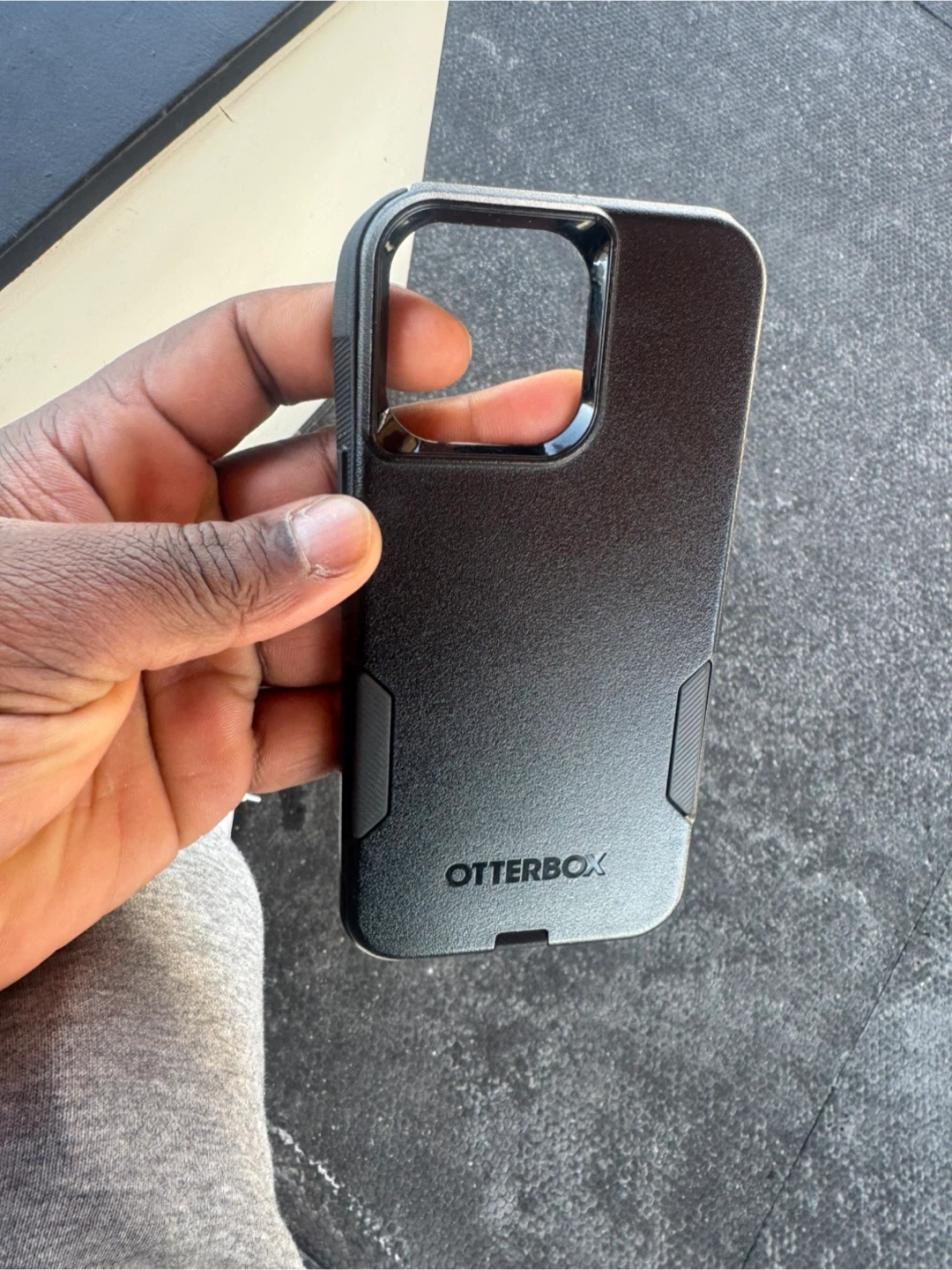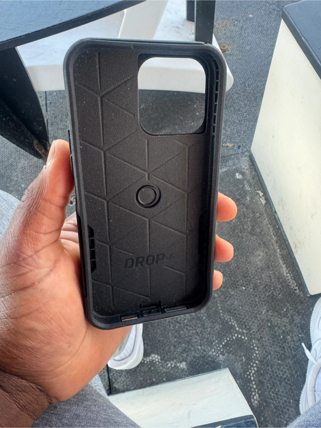 This is an OtterBox phone case. It's black and has DROP+ protection. It fits an iPhone 15 pro max