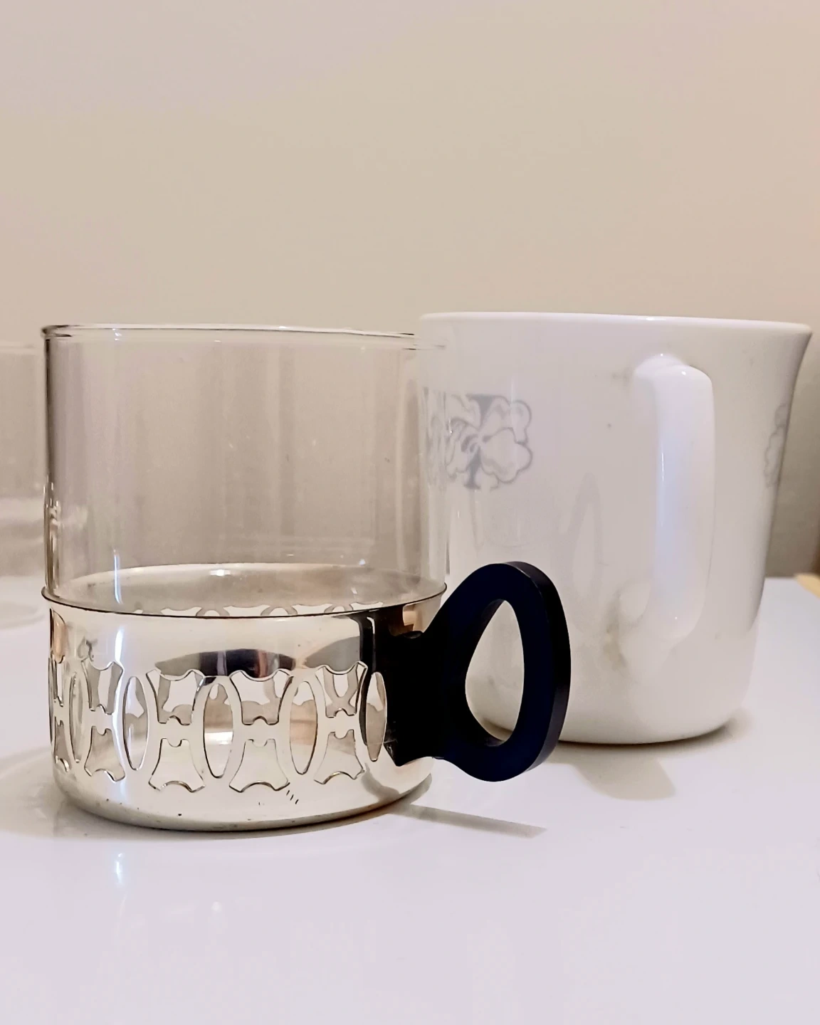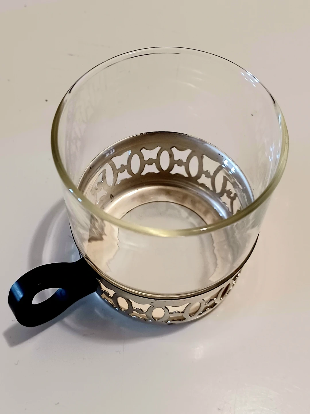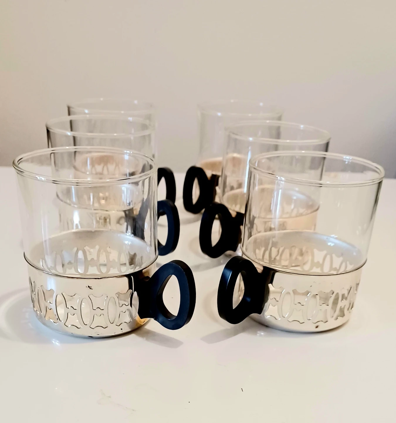 Vintage 1970s charming set of Six Kim S.P. Brass and glass cups, perfect for adding a touch of vintage elegance to your beverage service. These feature a unique design with ornate silver-plated brass holders and sleek black handles.