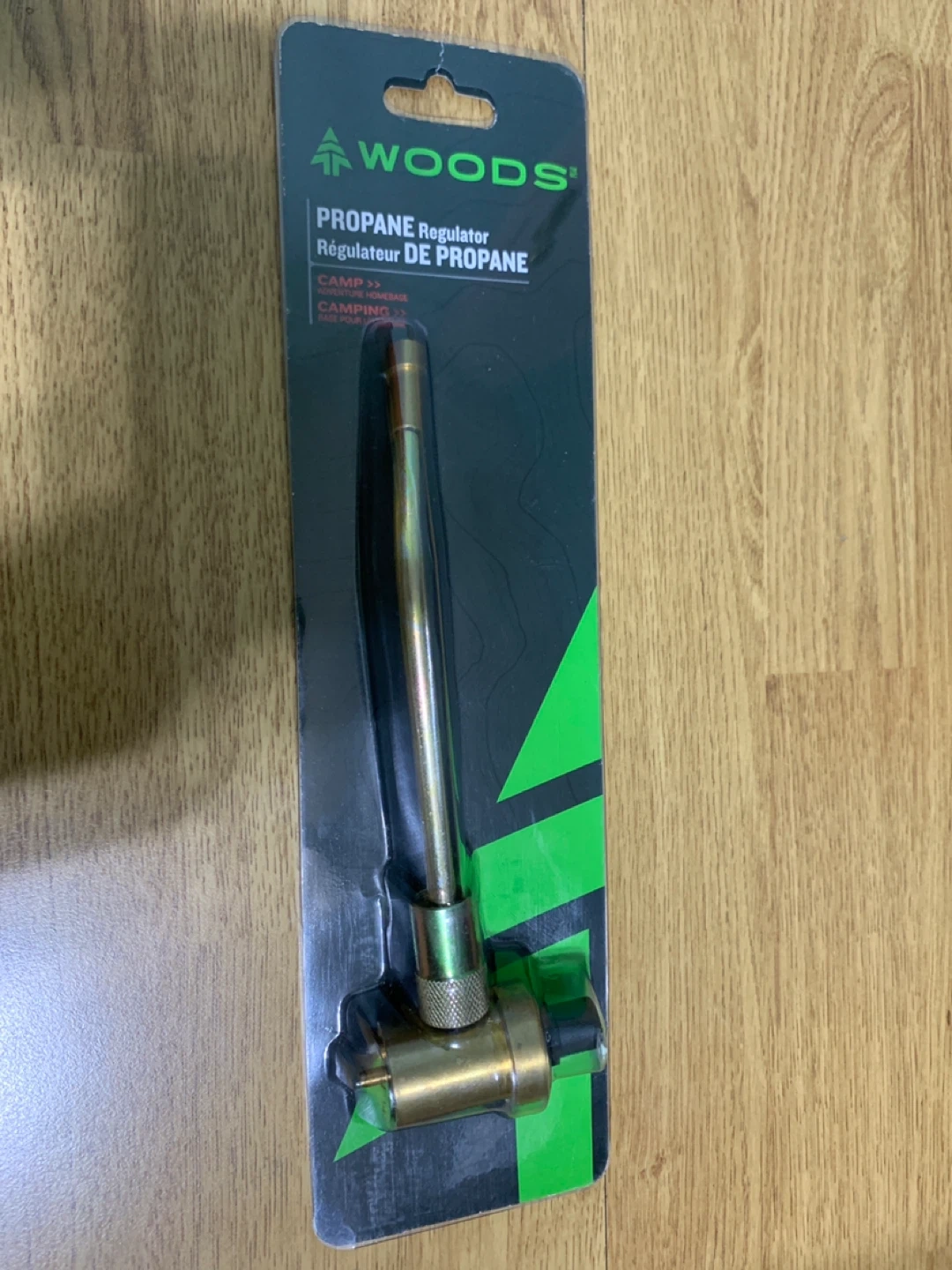 Woods propane regulator designed for camping use. It's made of metal components. This regulator connects propane tanks to appliances.