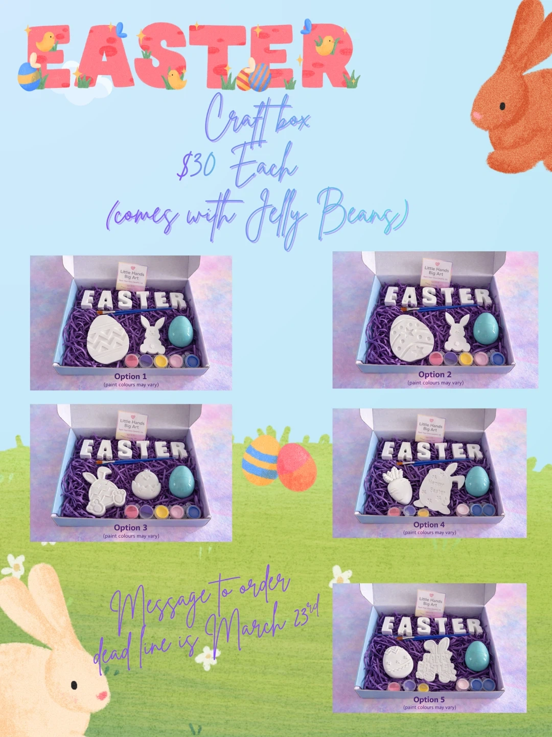 Each Little Hands Big Art Easter Craft Box includes everything needed for a fun painting activity: