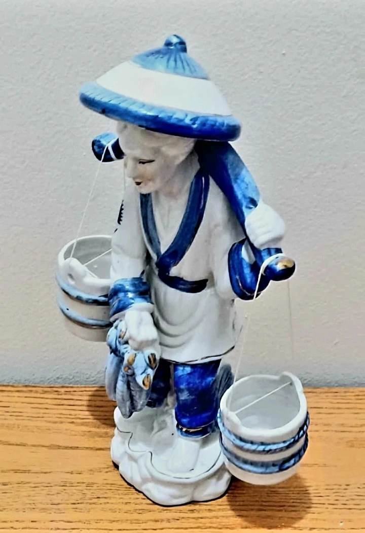 Vintage, Collectible, Decorative Chinoiserie , Hand Painted Statue. Intricate details of a Fisherman wearing a traditional straw hat and carrying buckets on a shoulder yoke . The primary color scheme is cobalt blue and white, with some gold detailing