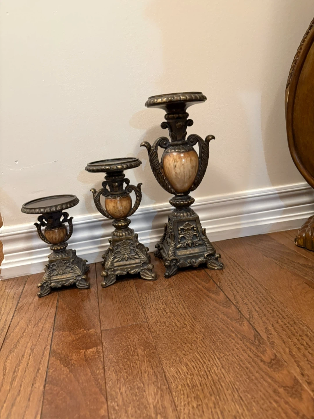 Selling a set of three vintage candle holders. They have a beautiful, ornate design with a bronze and cream colour scheme. They add a touch of elegance to any room!