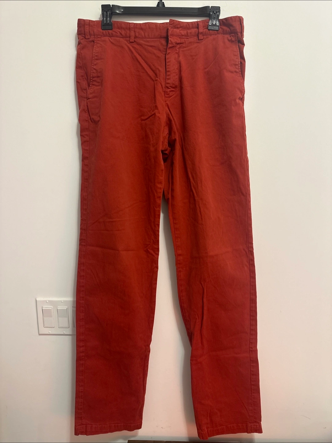 Selling a pair of red chinos pants. They're in great shape and ready for a new home! The colour is a nice, earthy red that's perfect for fall. Feel free to message me with any questions!