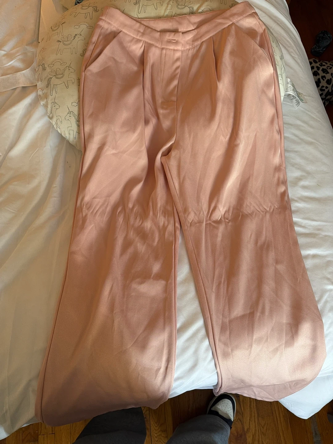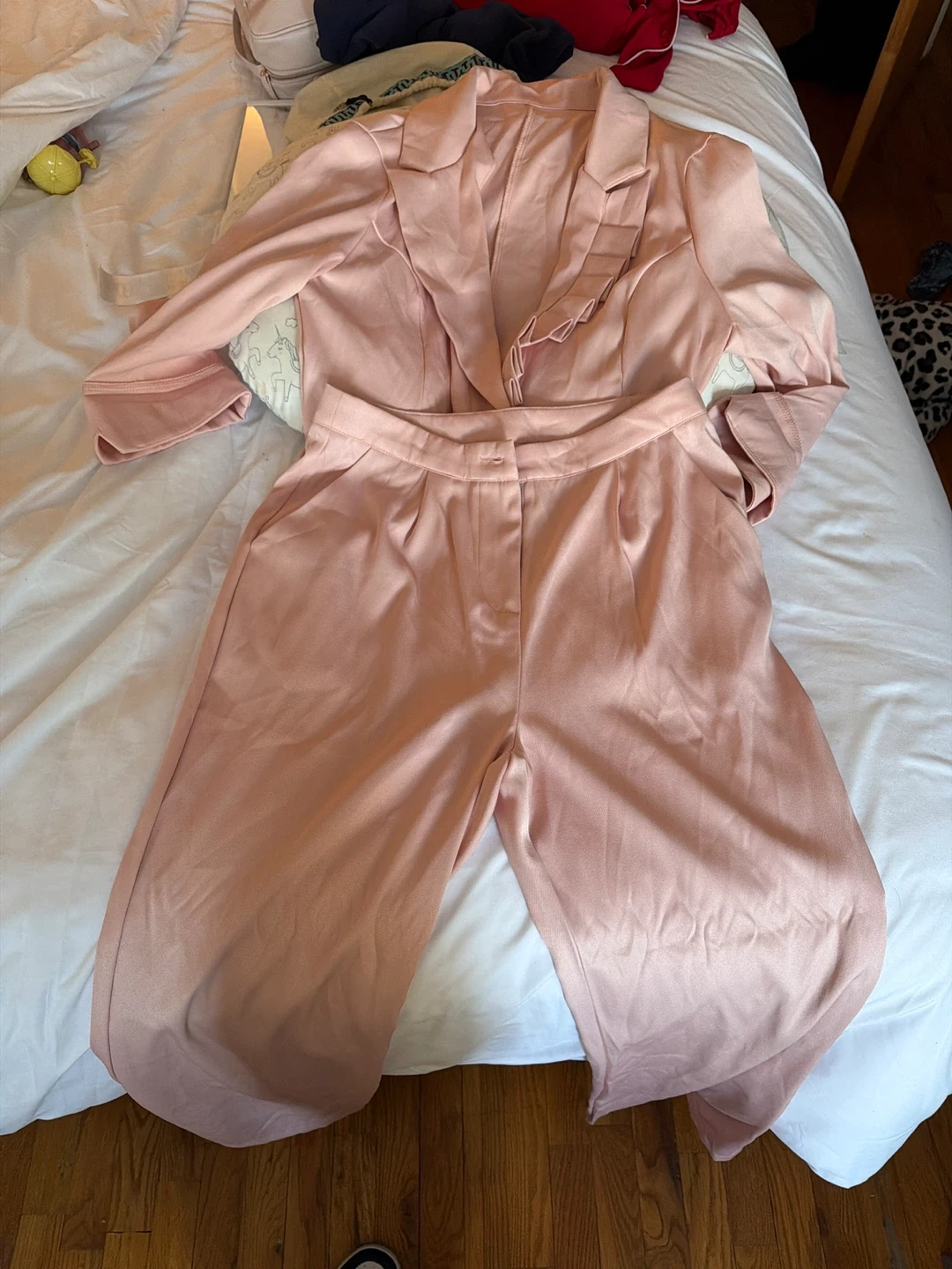 A coordinating pink blazer and wide leg pants set. The blazer has a single button closure and notched lapels. The pants feature a high waist with a pleated front. Lightweight fabric.