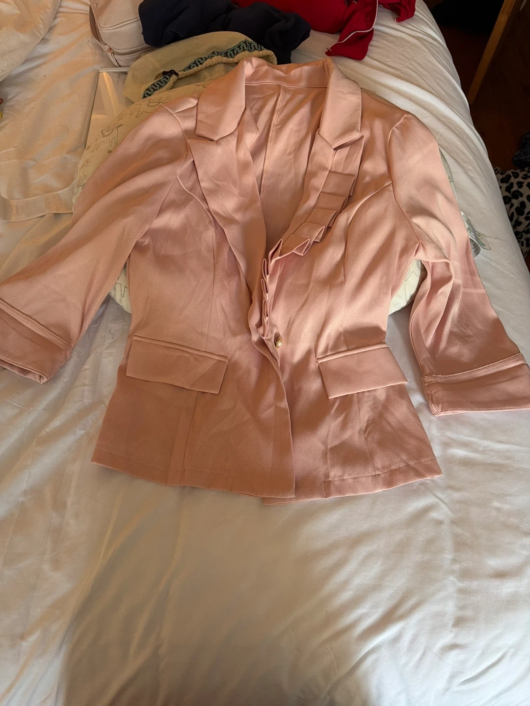 A coordinating pink blazer and wide leg pants set. The blazer has a single button closure and notched lapels. The pants feature a high waist with a pleated front. Lightweight fabric.