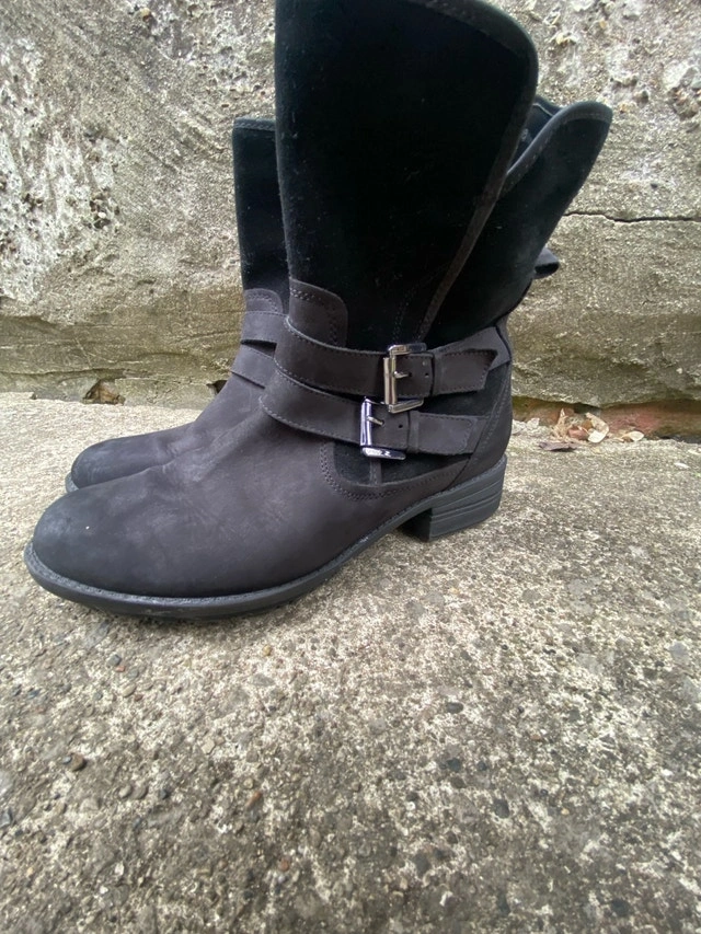 Step out in style with these Blondo black suede waterproof boots, size 7. These used boots feature a stylish buckle and a convenient zipper, making them both fashionable and functional. Ready for new adventures, be it a coffee run or a countryside stroll.