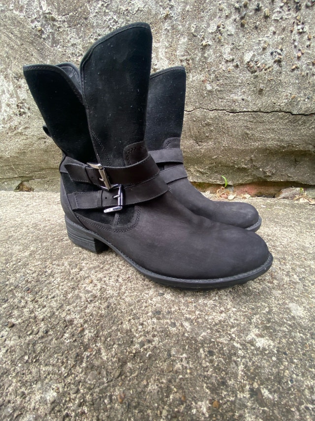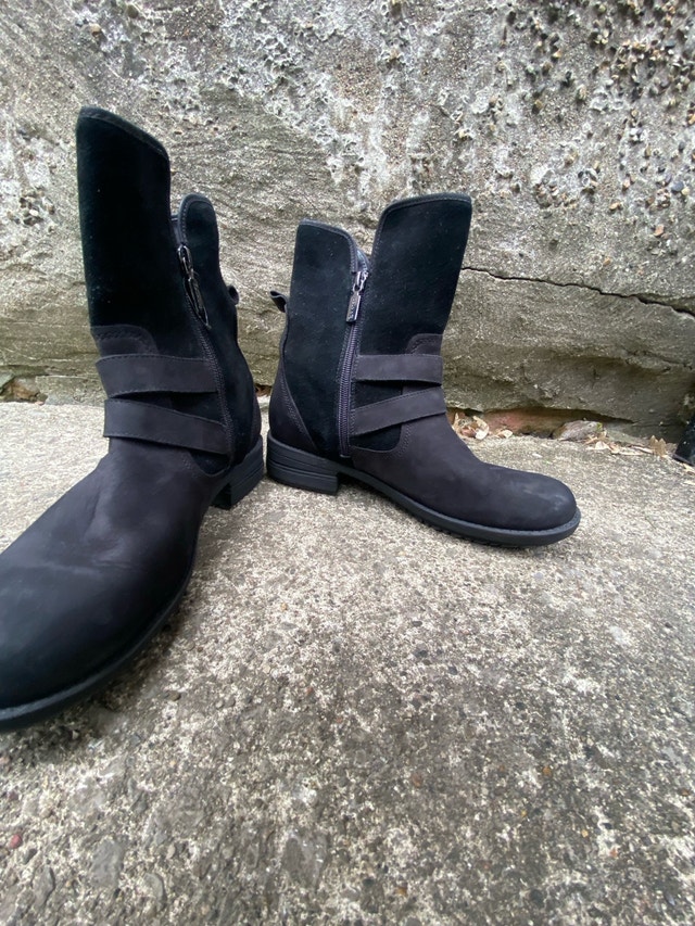 Step out in style with these Blondo black suede waterproof boots, size 7. These used boots feature a stylish buckle and a convenient zipper, making them both fashionable and functional. Ready for new adventures, be it a coffee run or a countryside stroll.