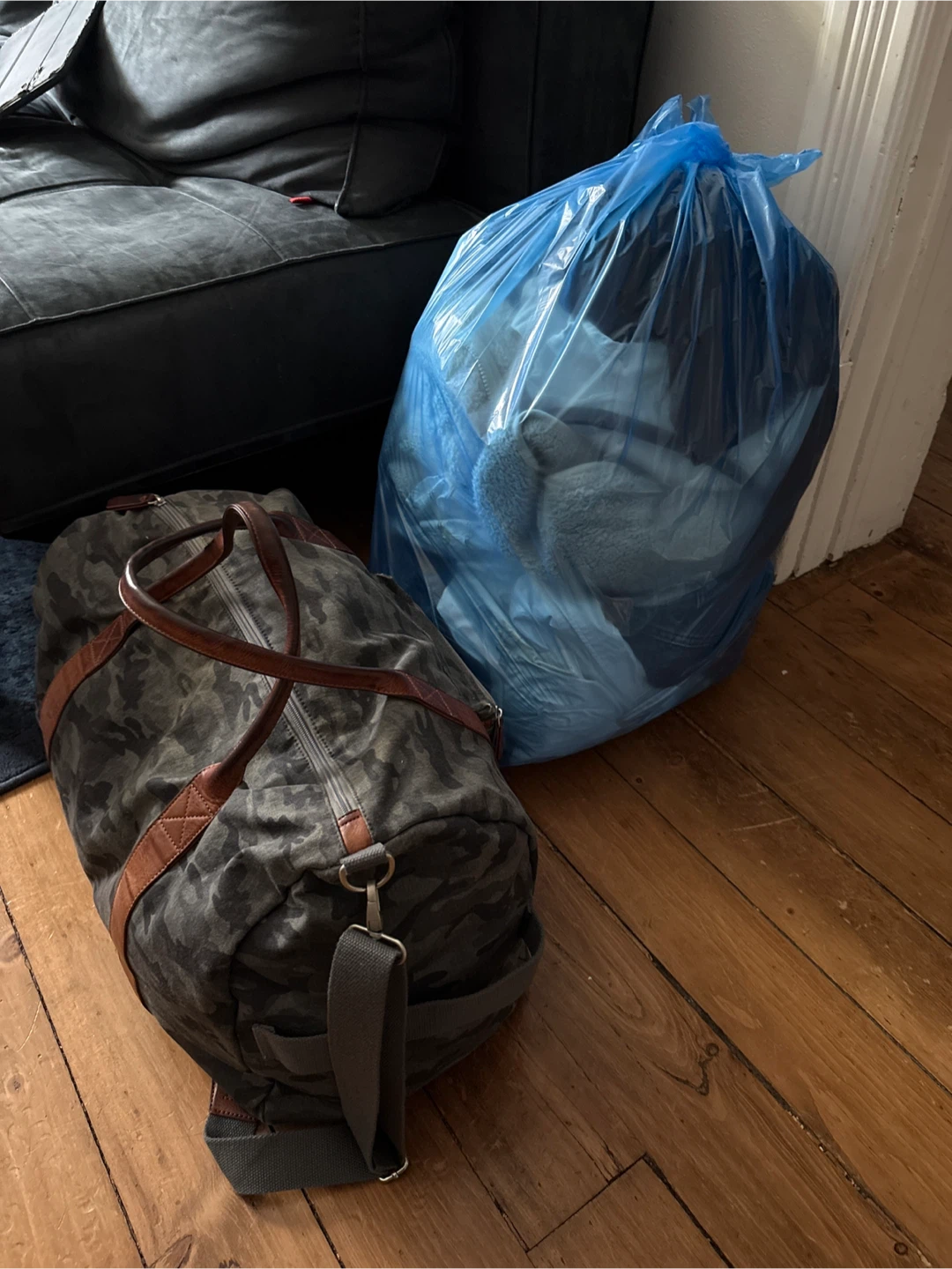 Intercept it before it goes to Value Village. Assorted men’s clothing, shirts, sweaters, pants, all large or extra large
