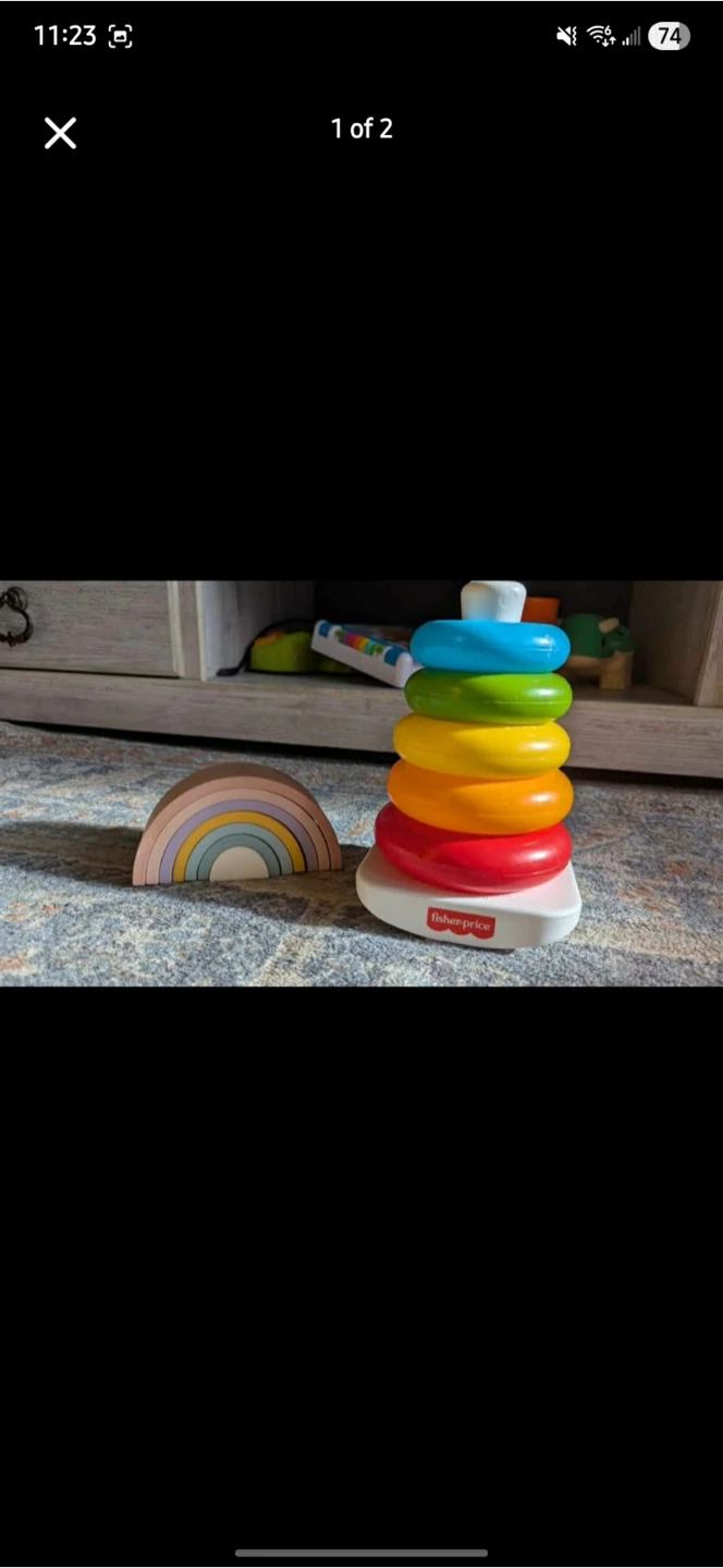 This Fisher-Price Rainbow Stacker toy features five colourful rings to stack on a sturdy base. It includes a wooden rainbow arch accessory. It's a classic toy for little ones to develop fine motor skills and learn about colours and sizes.