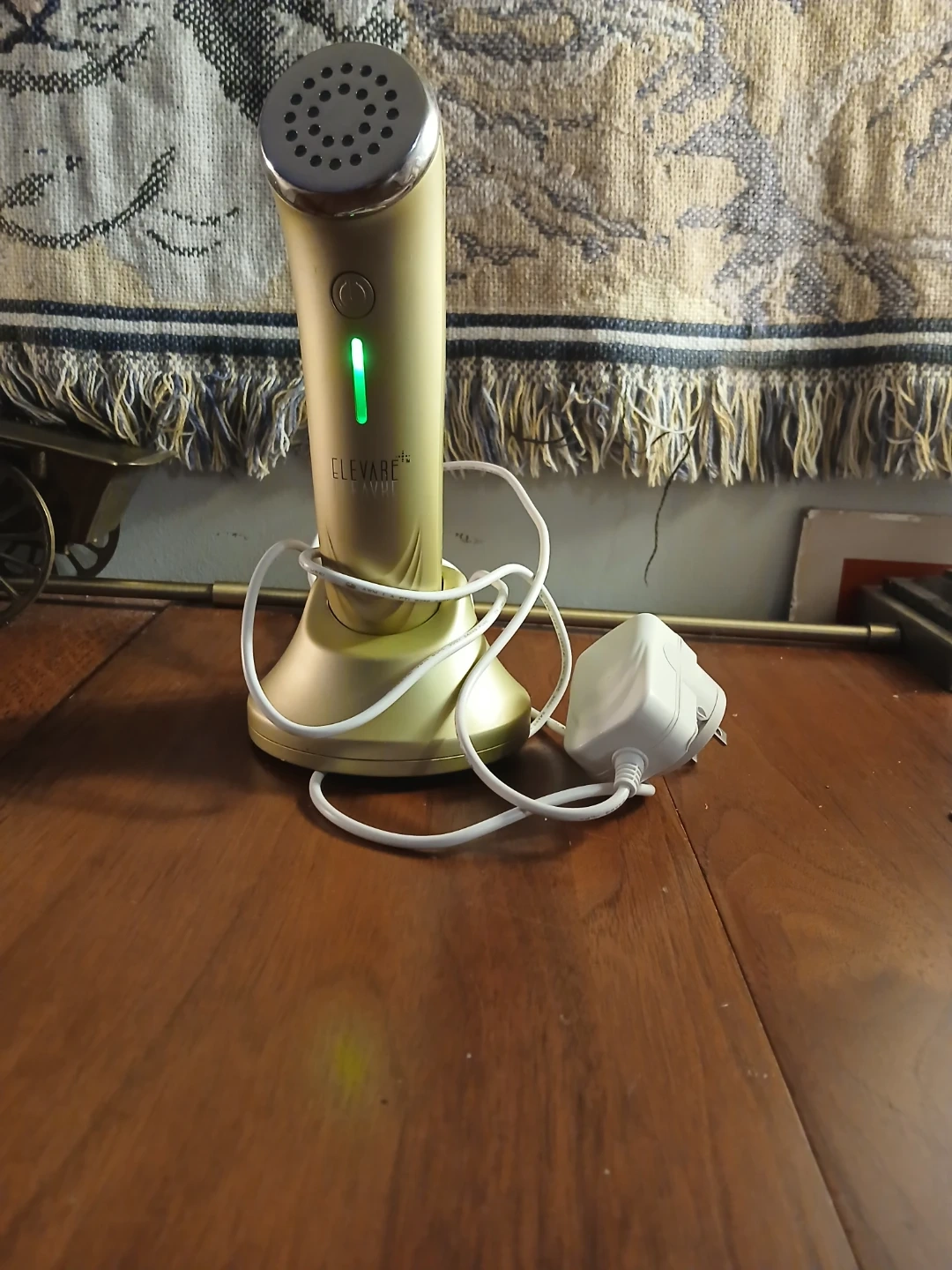 This is an ELEVARE AGE REVERSE facial wand. It comes with its charging base and power adapter. The device has a green indicator light when in use.