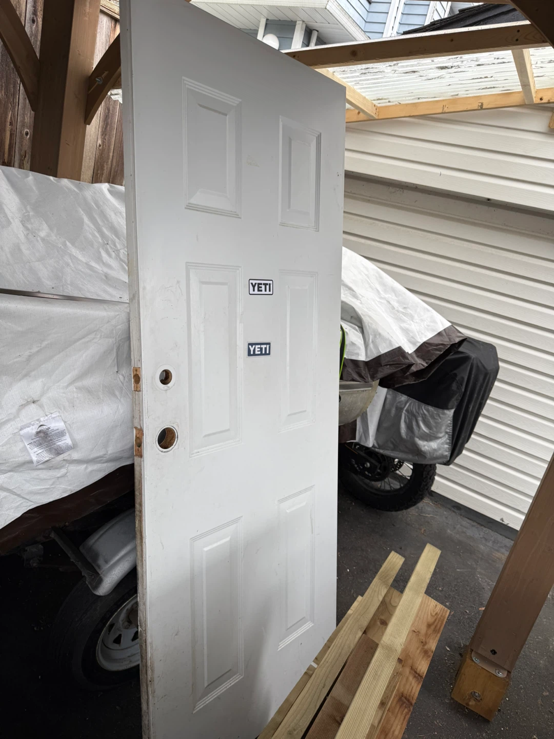 This is a white exterior door. The door is a 32 inch standard size. It could be used as a replacement door or for a DIY project.