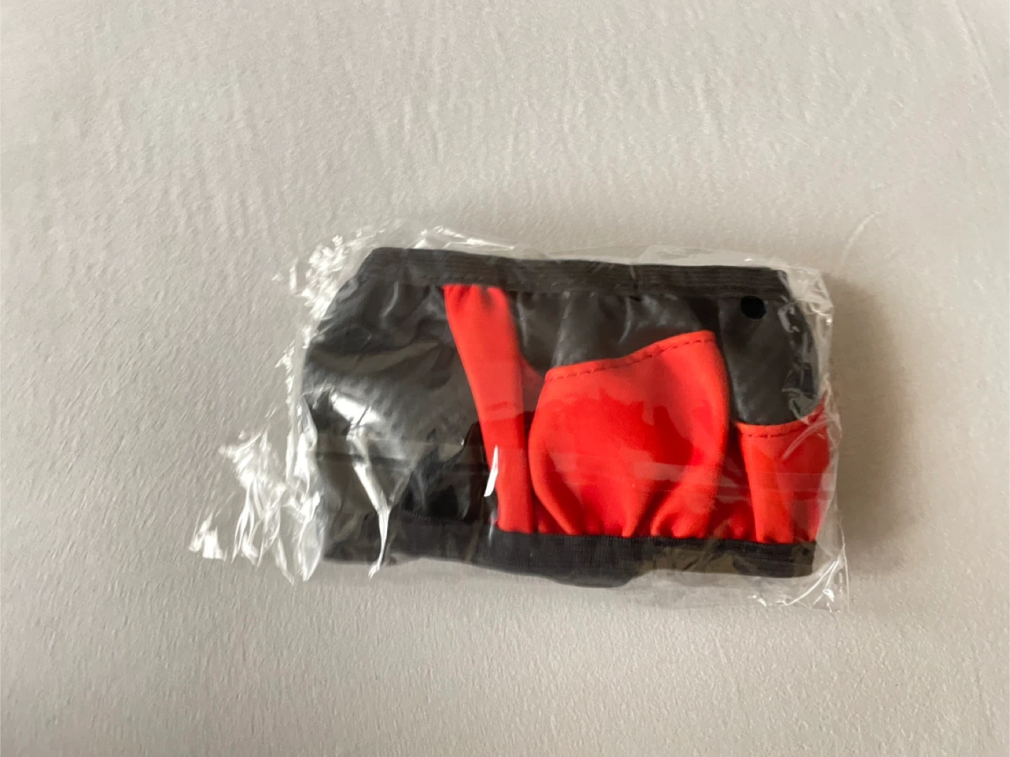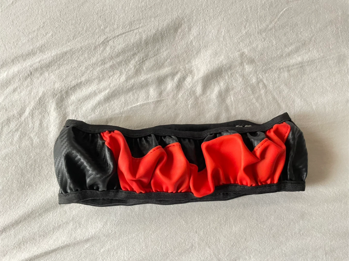 This steering wheel cover has a carbon fiber look on the sides and red fabric accents. It's made of durable material and comes in its original packaging. The elastic band ensures a snug fit on most steering wheels.