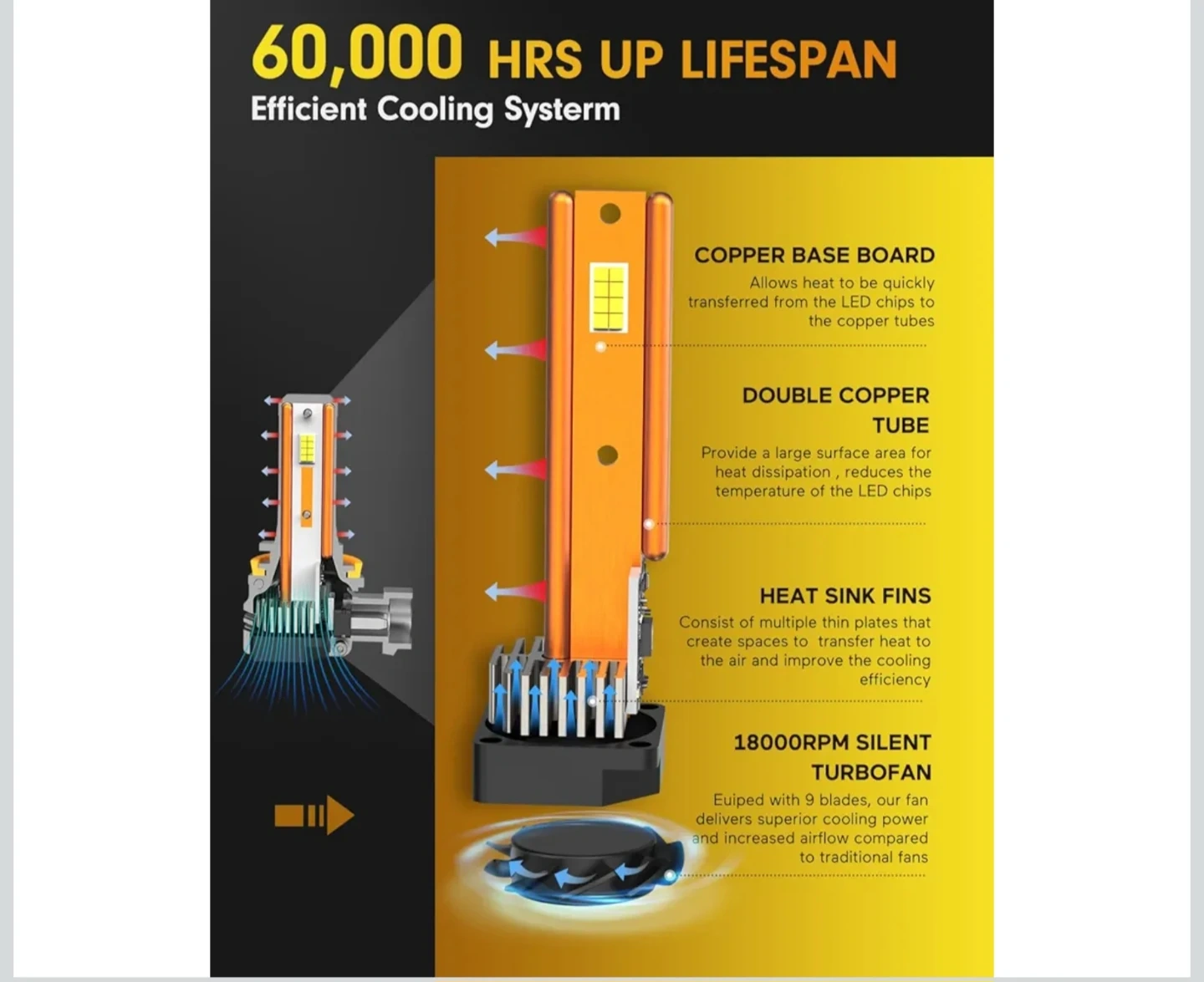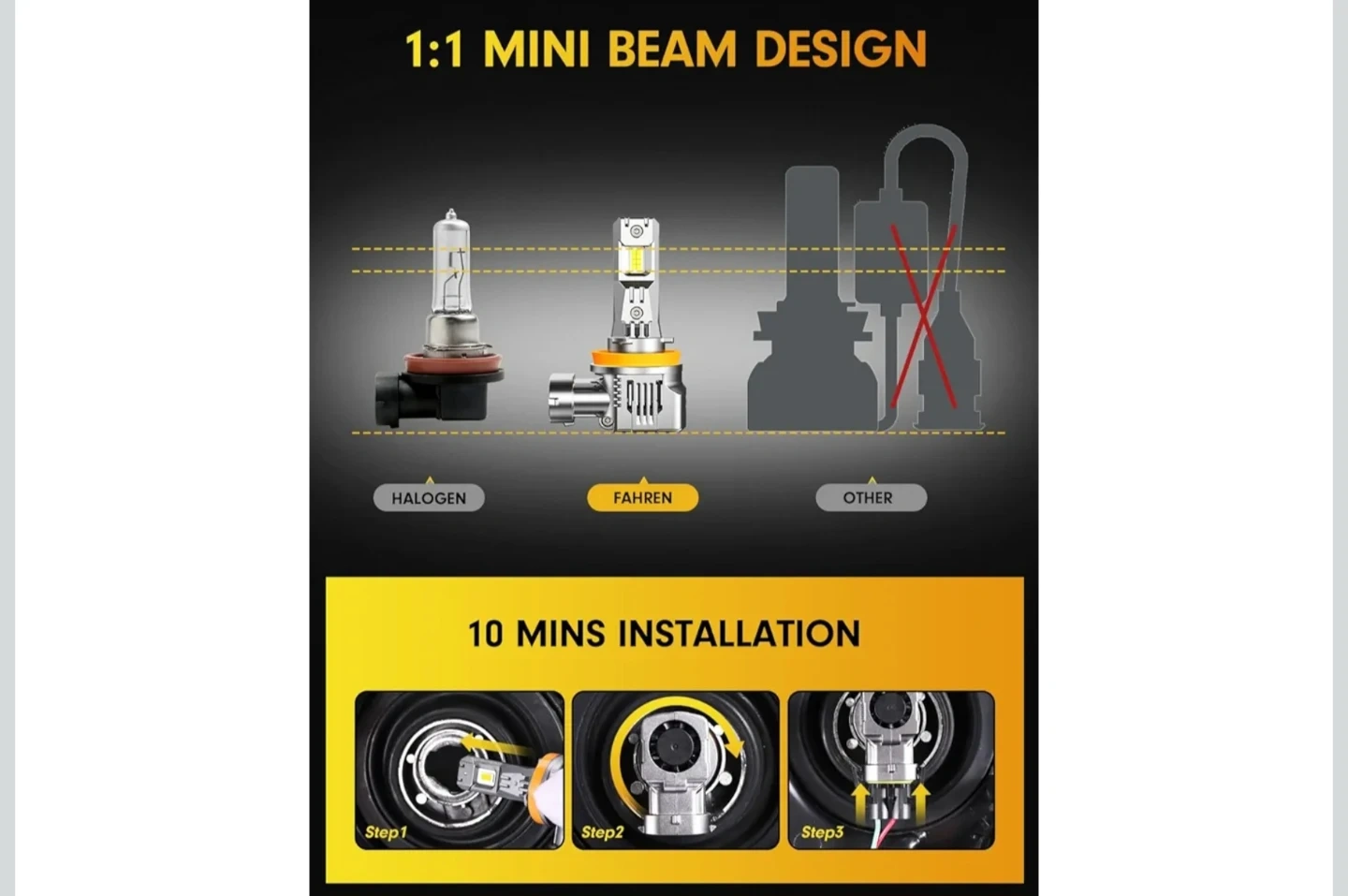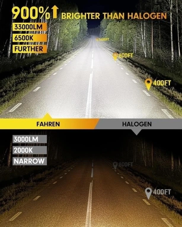 These FAHREN H11 LED bulbs offer 33,000 lumens and a 6500K cool white light. They feature efficient cooling with a copper base board, double copper tube, and a silent turbofan. Installation is simple and takes about 10 minutes.
