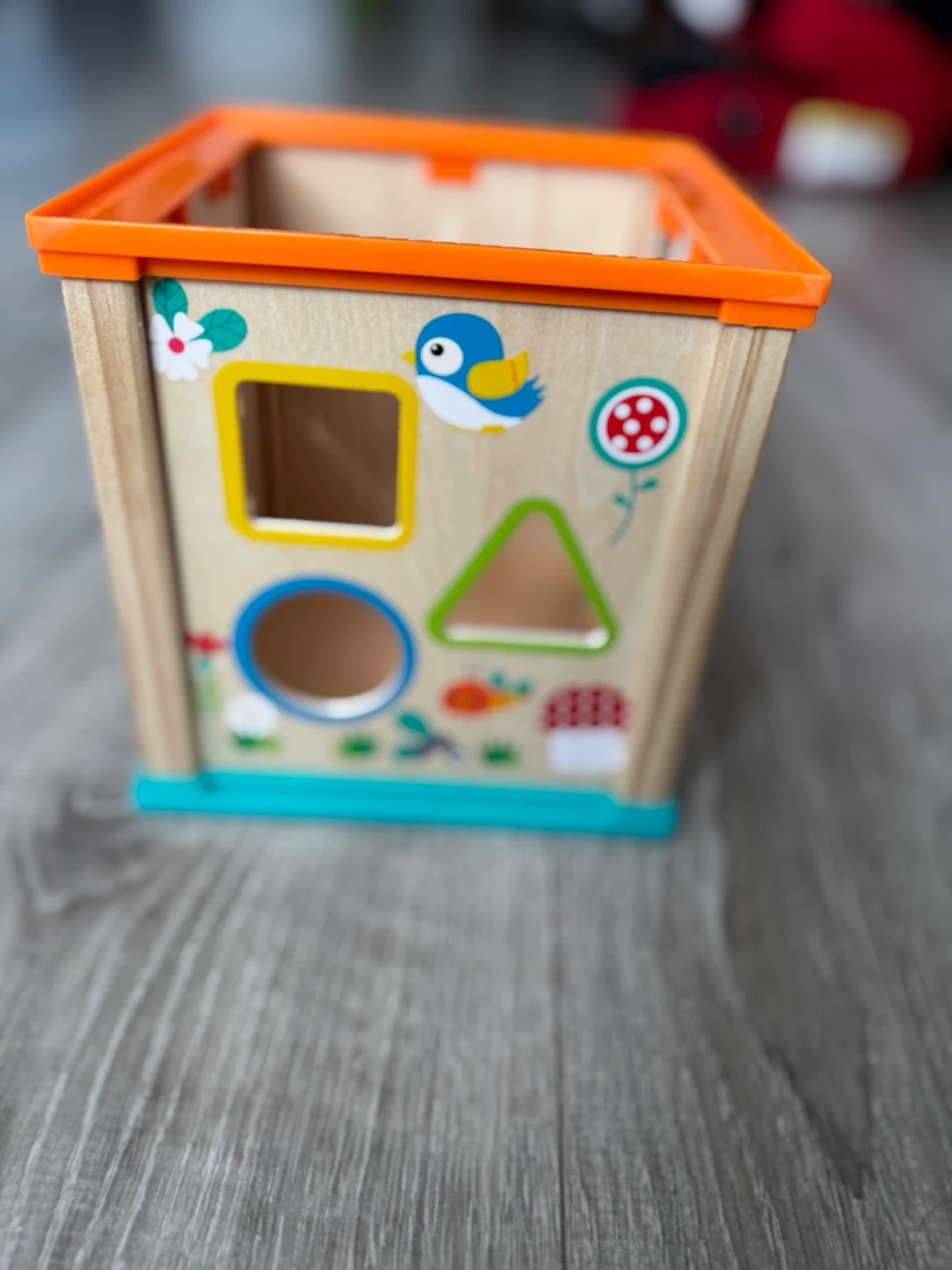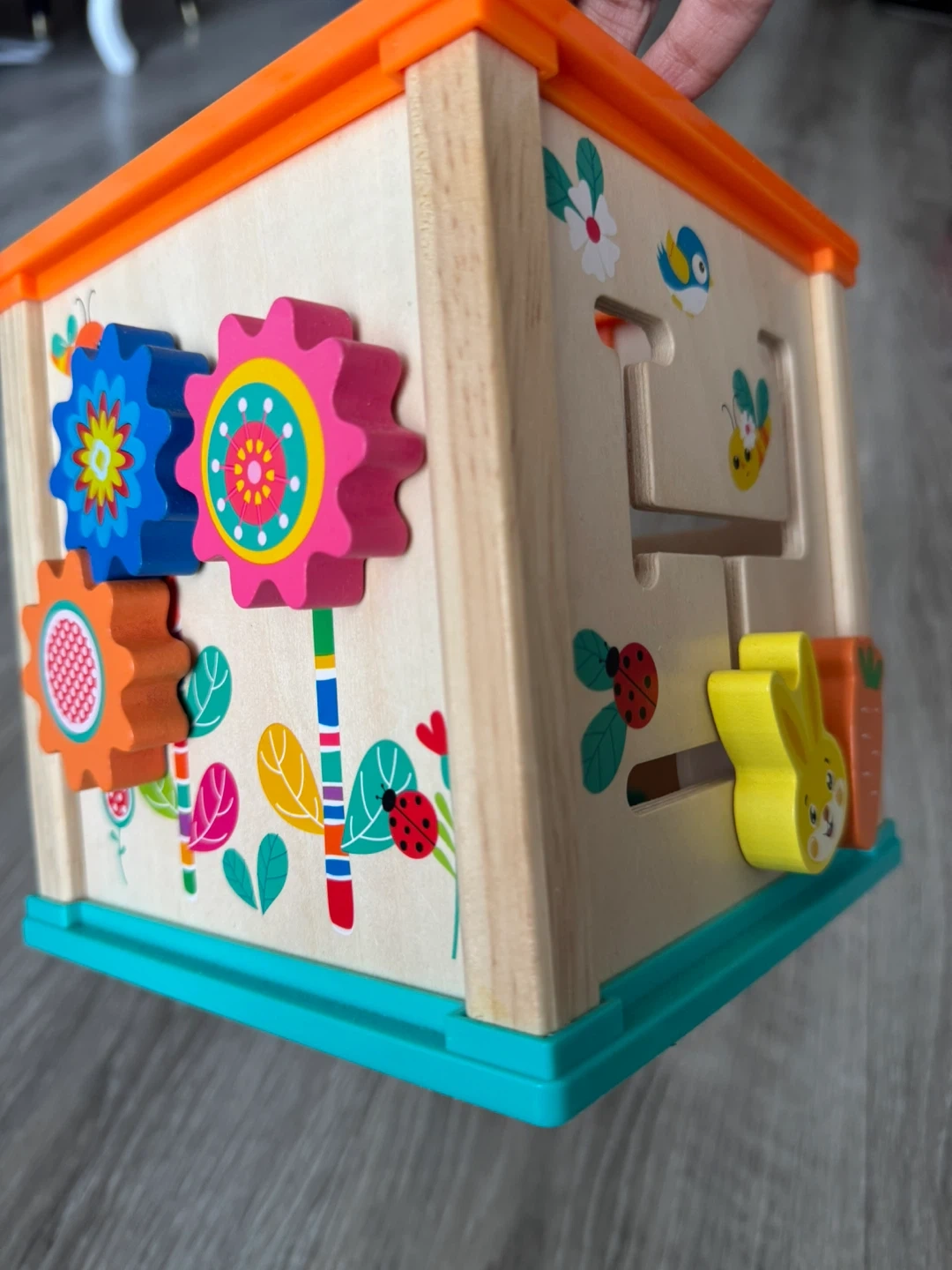 wooden activity cube features gears, shape sorting, and doors with peek-a-boo bunnies. It's made of wood with colourful accents. This toy is great for developing fine motor skills and hand-eye coordination..