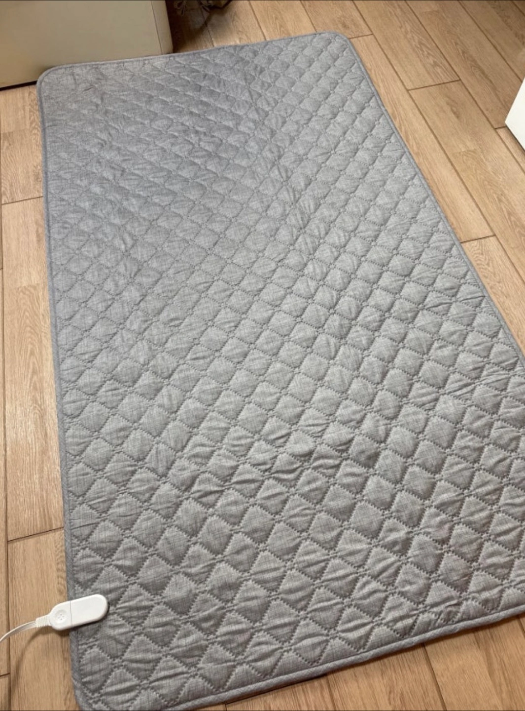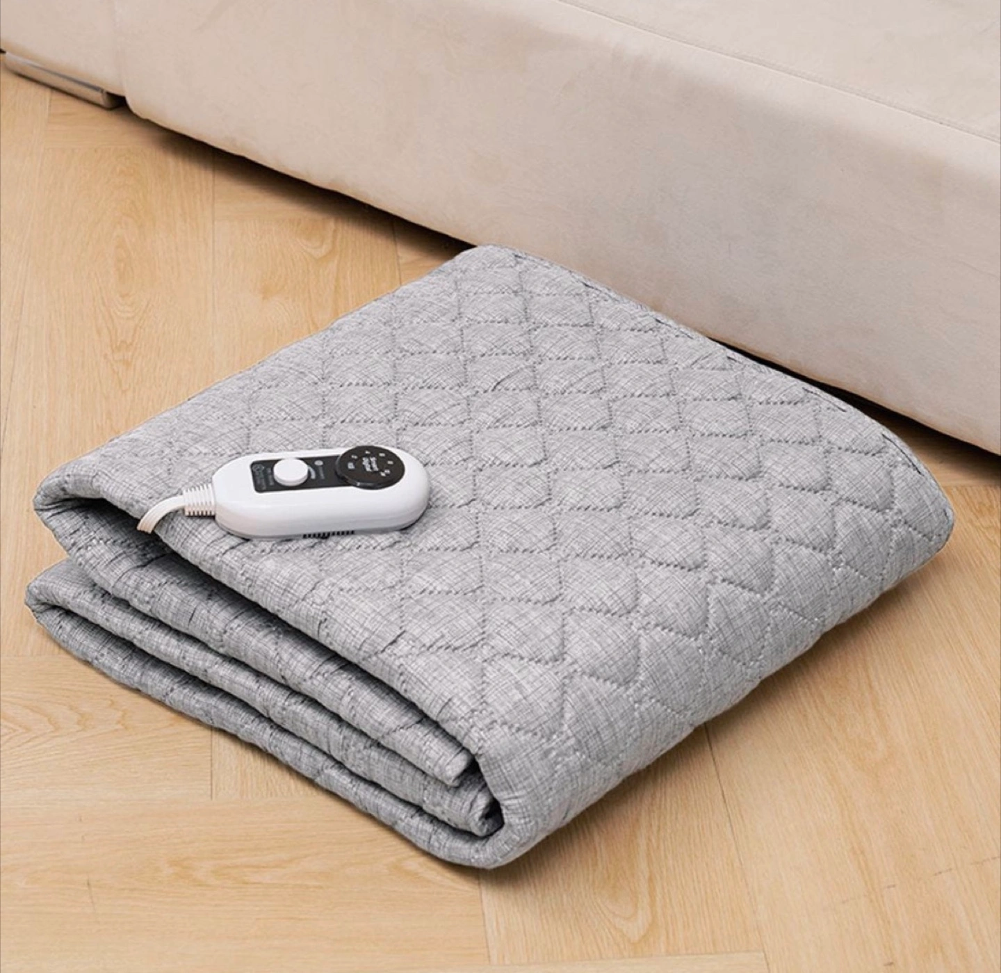 Grey electric heated blanket pad. Single size at 100 x 180 cm. Quilted fabric. Includes controller.