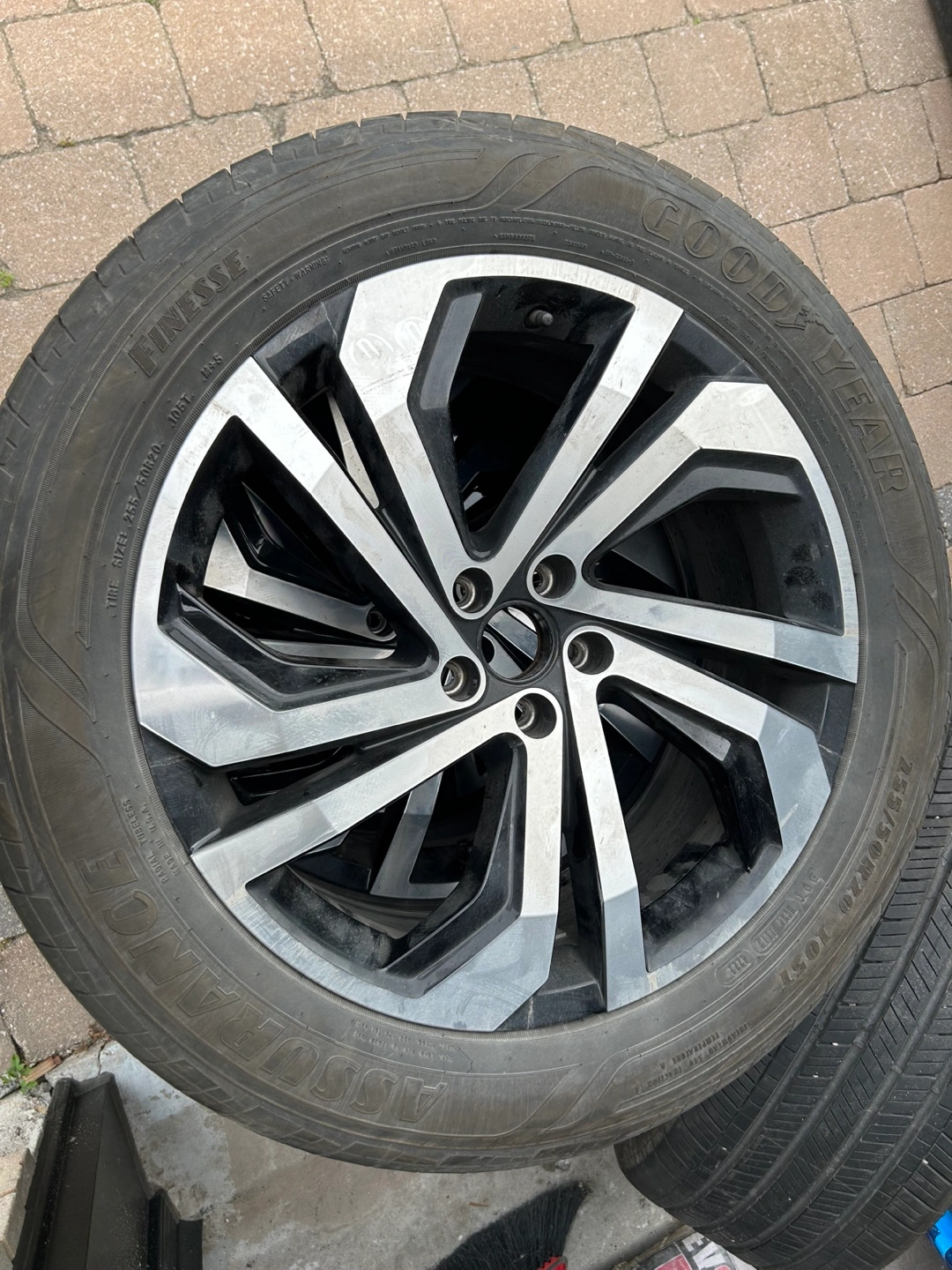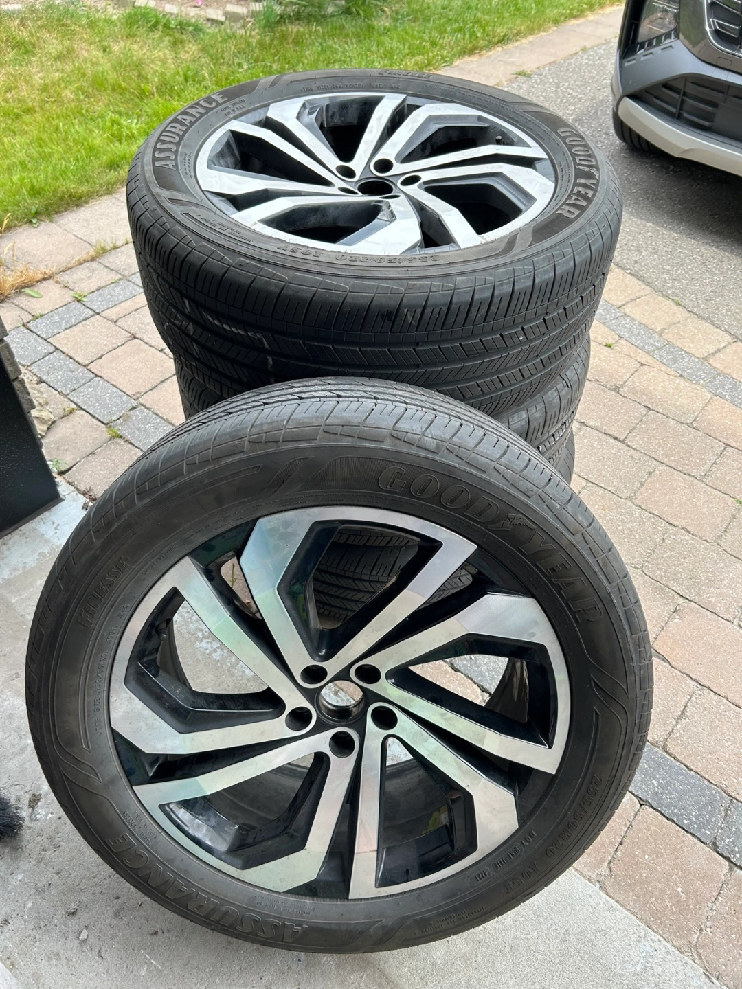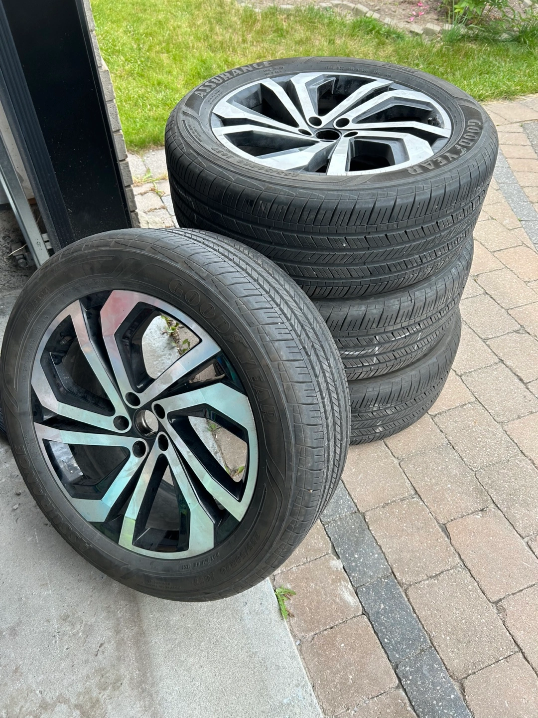 Selling a set of Goodyear Assurance tires with rims. The tire size is 235/50R20. They are in used condition but still have plenty of tread left! VW Atlas was written off with winters on, these were in storage, not impacted.