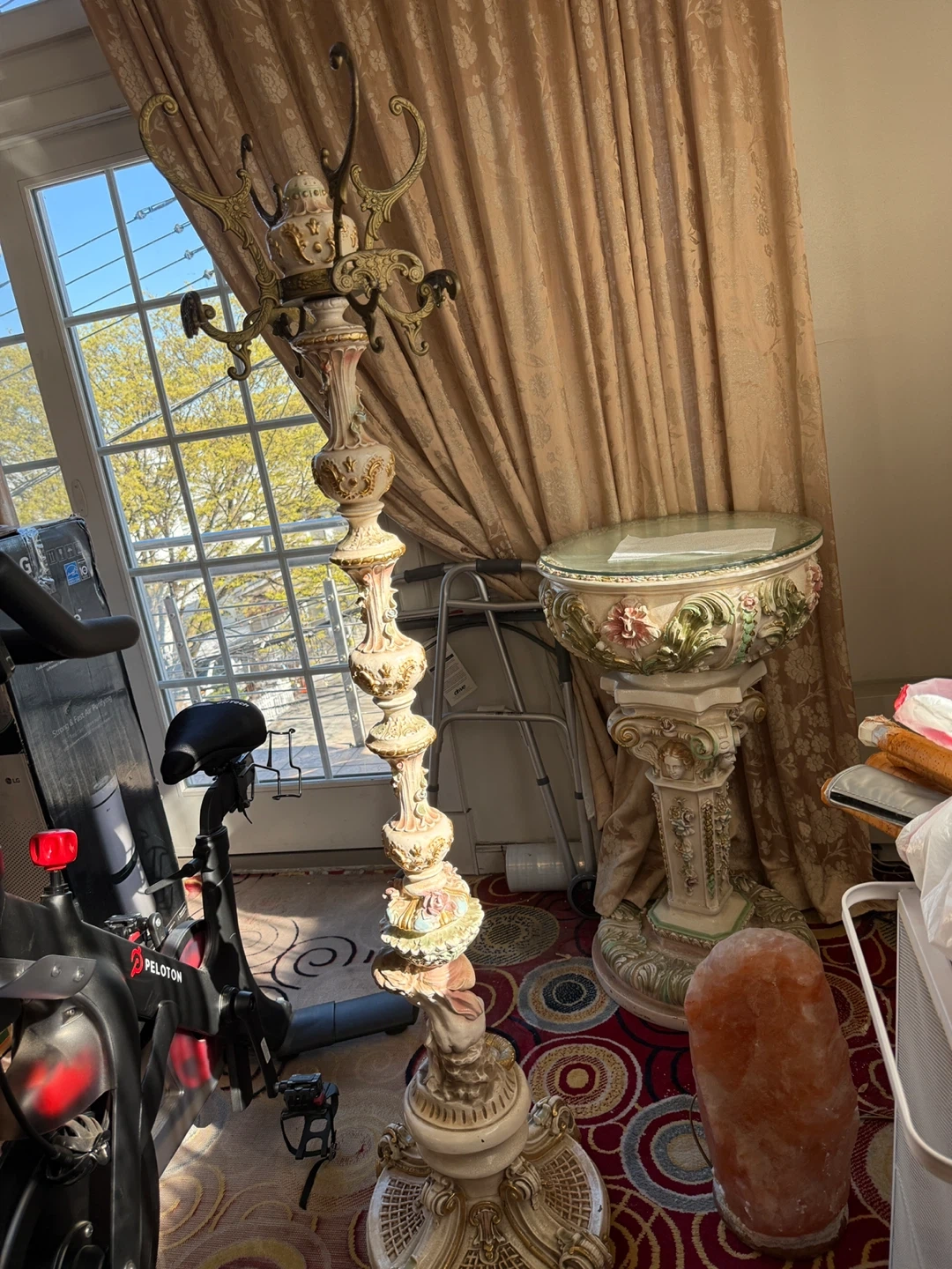 Beautiful vintage coat rack stand with an ornate design. It features multiple hooks for hanging coats, hats, and scarves. The stand has a decorative base and intricate detailing throughout.
