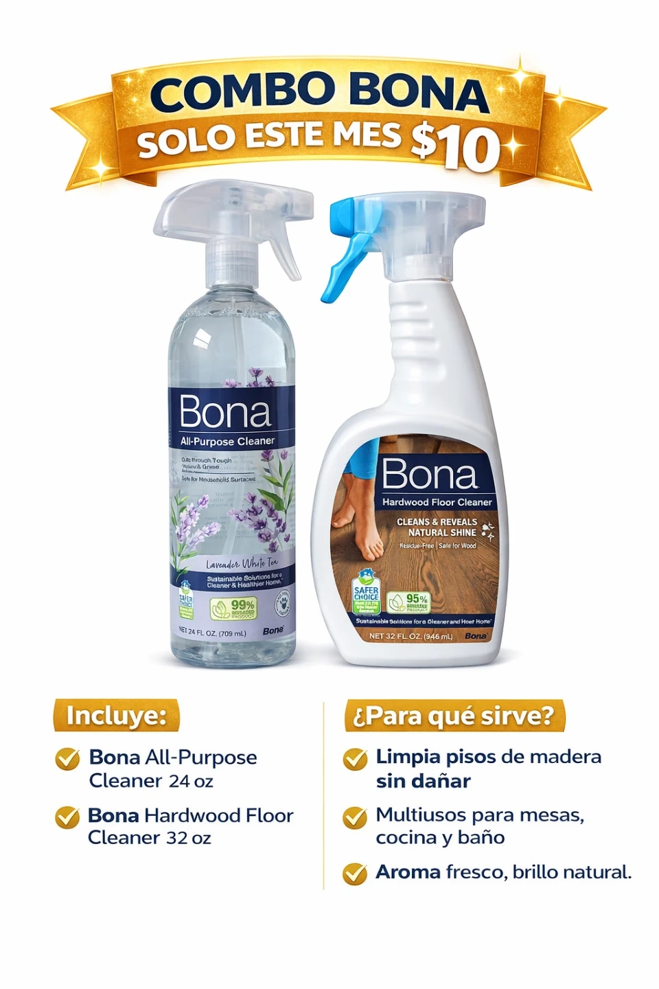 This Bona combo includes a 24 oz All-Purpose Cleaner and a 32 oz Hardwood Floor Cleaner. The All-Purpose Cleaner is lavender white tea scented and safe for household surfaces. The Hardwood Floor Cleaner cleans and reveals natural shine without residue.