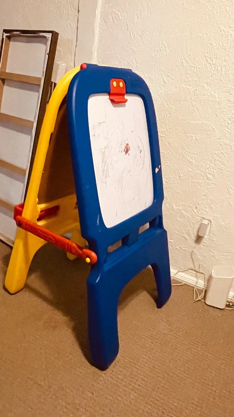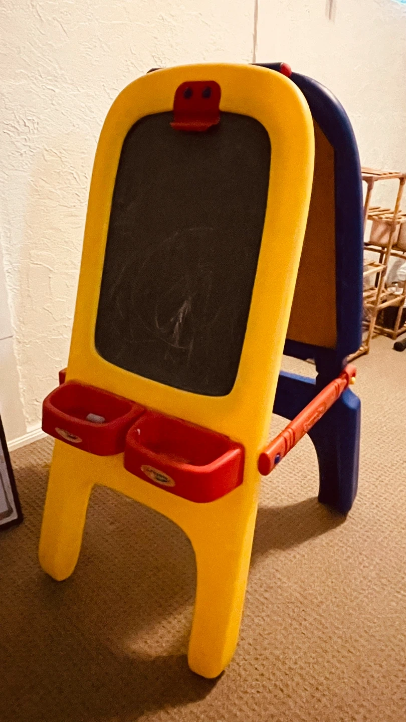 This is a Crayola easel with a chalkboard and dry-erase board. It has two red trays for art supplies. It's great for kids who love to draw and create!